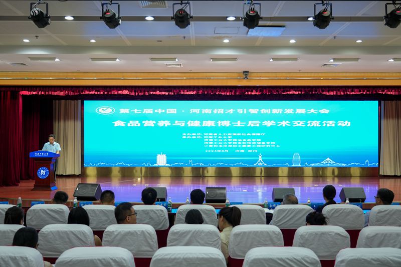 由河南省人力资源和社会保障厅主办、河南工业大学承办的“第七届中国·河南招才引智创新发展大会食品营养与健康博士后学术交流活动”于2024年8月24日至25日在我校隆重举行。河南省人力资源和社会保障厅二级巡视员余耀武、河南工业大学党委副书记周相寅出席开幕式并致辞;河南省人力资源和社会保障厅博士后与留学人员工作处处长王君、人事处处长张强、粮油食品学院党委书记张兴振、粮油食品学院院长刘昆仑出席了开幕式。开幕式由刘昆仑主持。来自江南大学、华南理工大学、沈阳农业大学、郑州大学、中国农业科学院农产品加工研究所、中国科学院天津工业生物技术研究所、堪萨斯州立大学等10多所国内外知名高校和科研院所的200余名专家学者、博士后研究人员和研究生参加了本次交流活动。