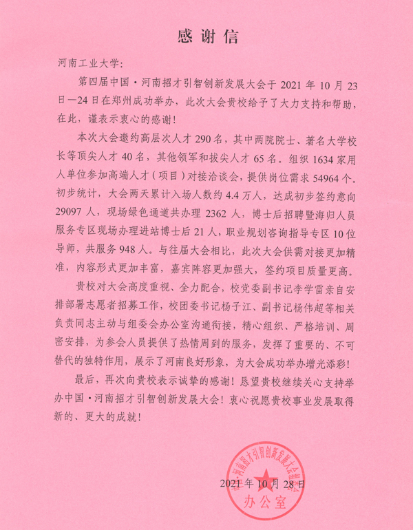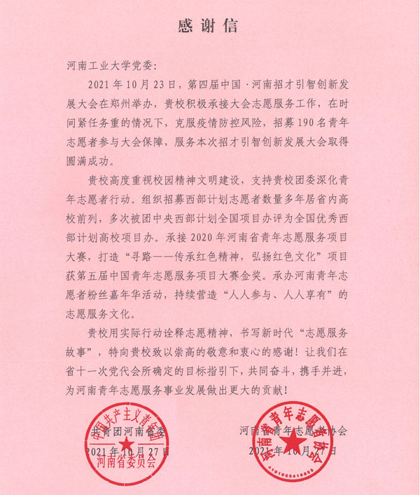 近日,我校圆满完成“第四届中国·河南招才引智创新发展大会”的志愿服务工作。大会组委会、河南团省委、河南青年志愿者协会等部门致函我校,对200余青年志愿者的工作给予了高度评价。会议期间,李成伟校长、河南团省委李丽书记等亲切慰问了我校志愿者。志愿者事迹受到多家省级媒体报道。