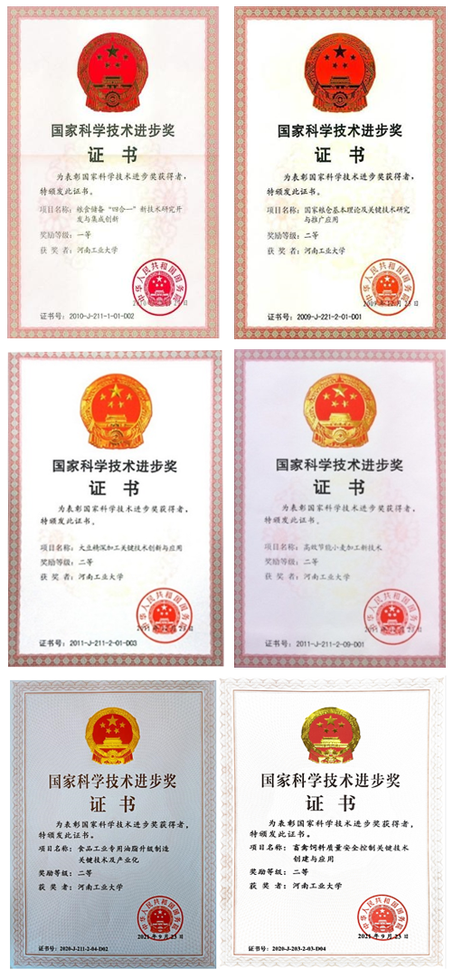 近年来,获国家科技进步奖9项,其中“粮食储备‘四合一’新技术研究开发与集成创新”获国家科技进步奖一等奖,是我国粮食行业近20年来的国家科技最高荣誉;2020年我校“食品工业专用油脂升级制造关键技术及产业化”“畜禽饲料质量安全控制关键技术创建与应用”2个项目,获得国家科学技术进步奖二等奖。制修订国际/国家/行业标准230余项,其中“小麦·规格”为国内第一个粮食领域国际标准;获中国标准创新贡献一等奖1项。