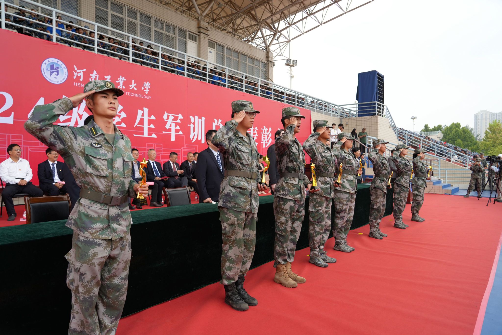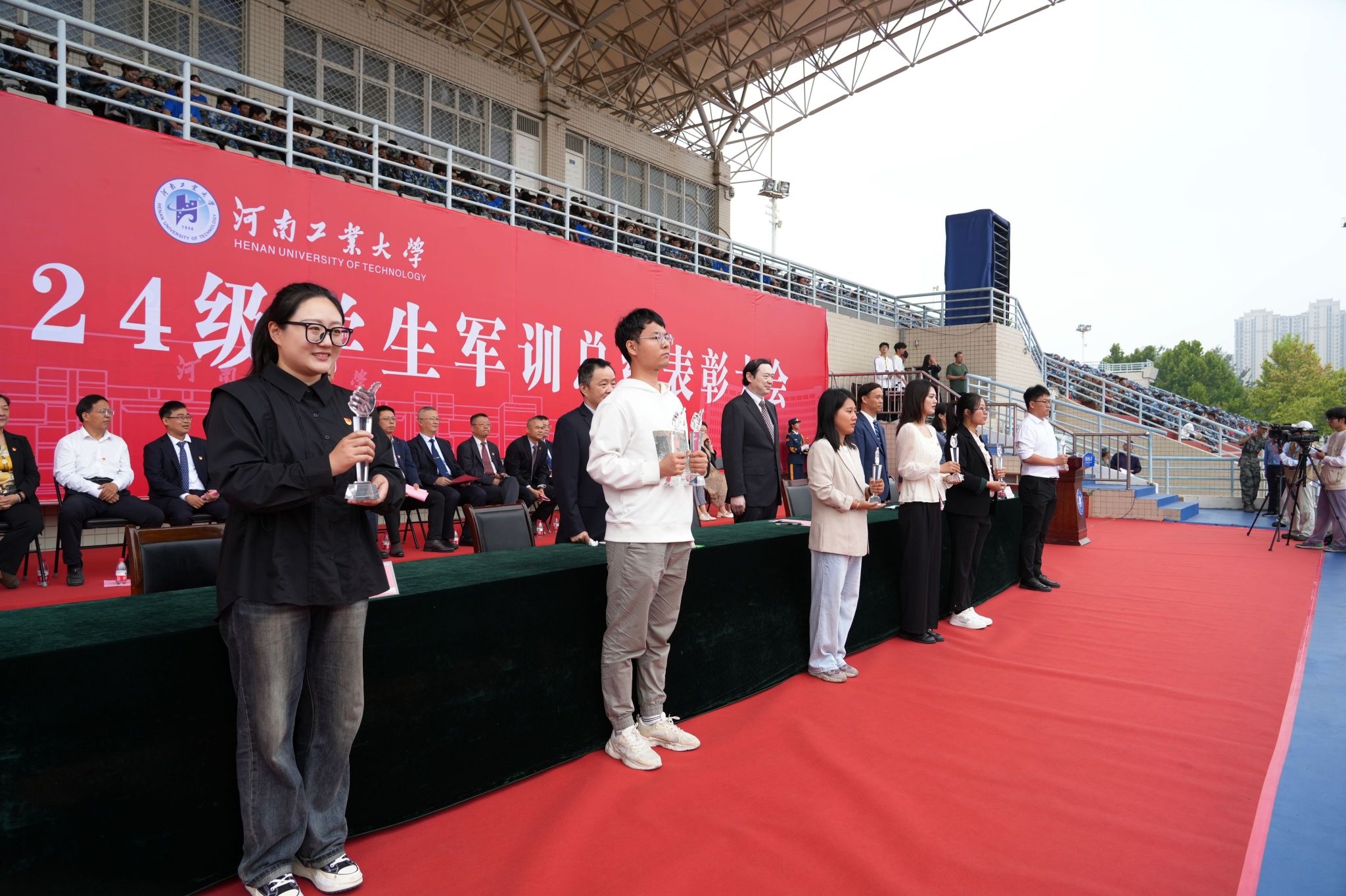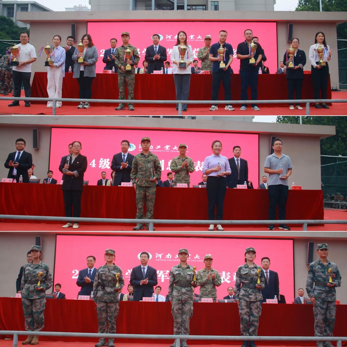 军训先进单位、队列先进集体、歌咏比赛先进集体、内务先进集体、军训优秀辅导员、优秀教官代表上台领奖