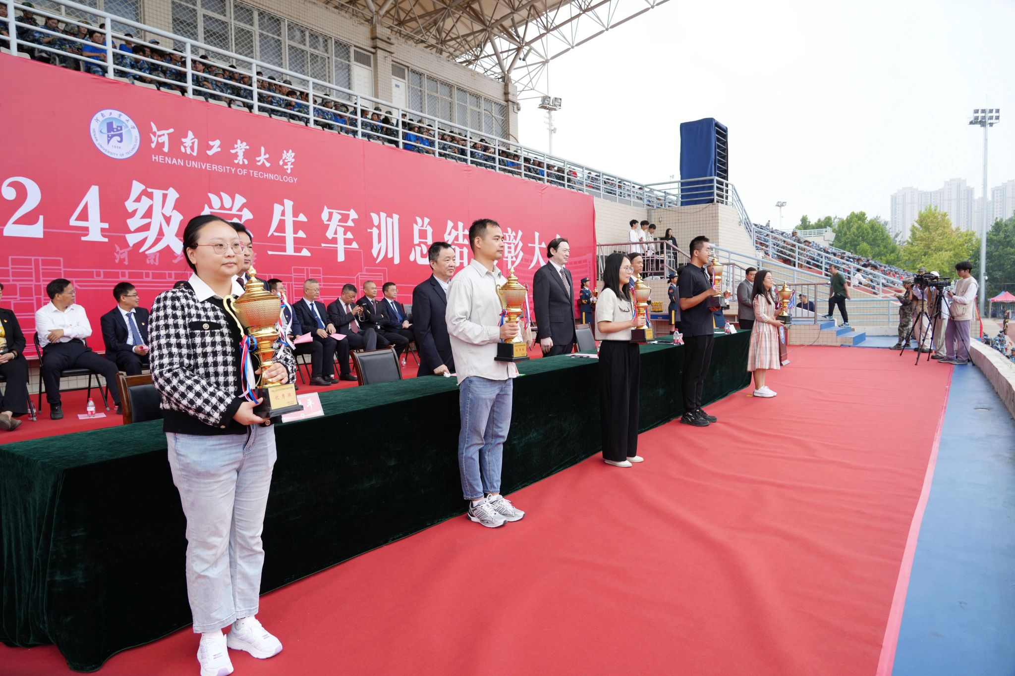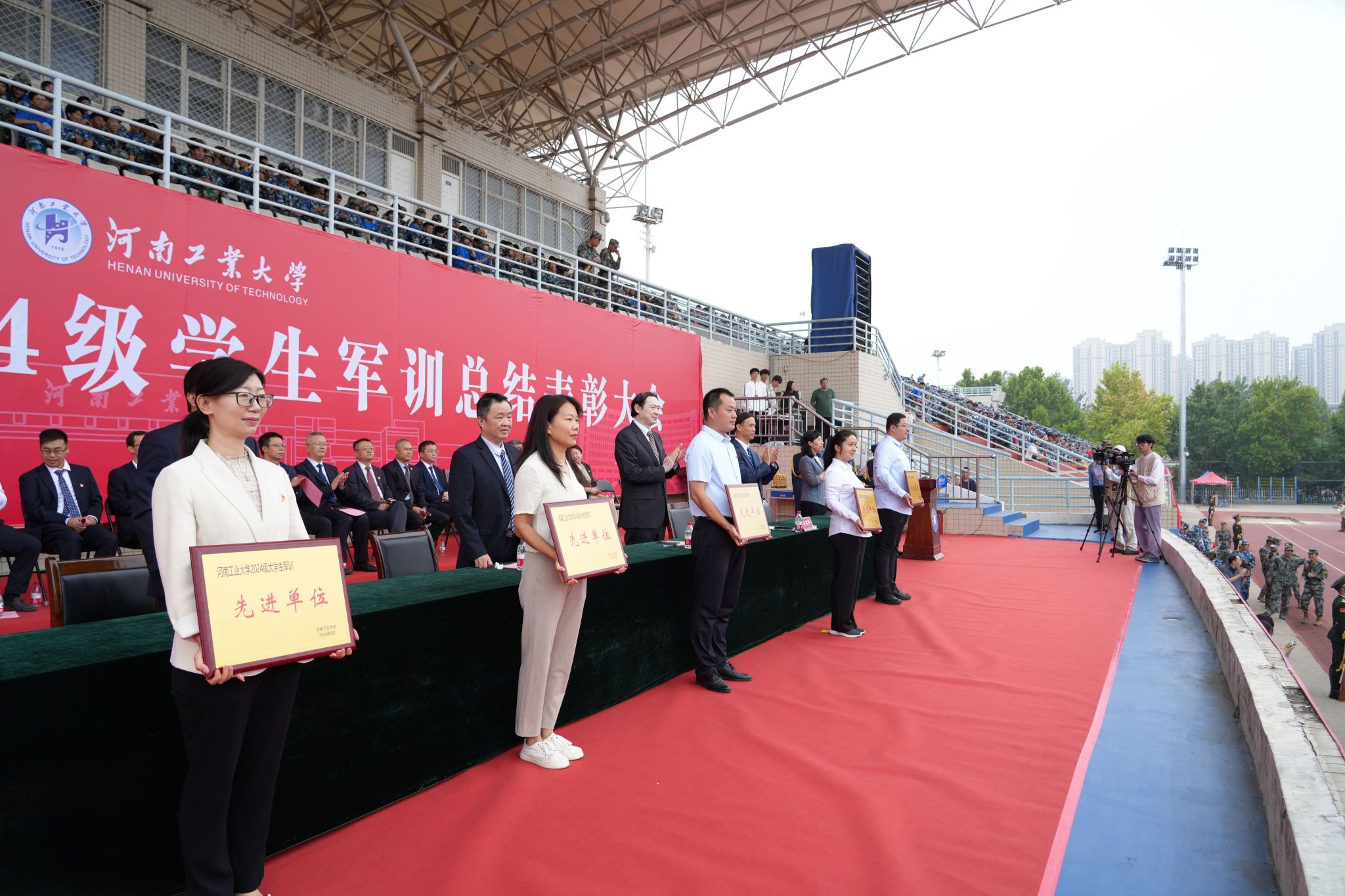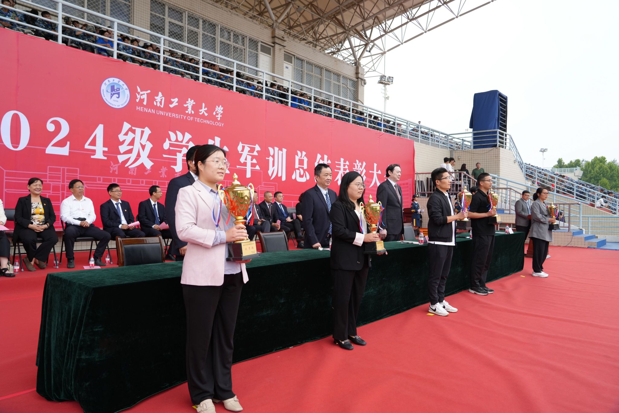军训先进单位、队列先进集体、歌咏比赛先进集体、内务先进集体、军训优秀辅导员、优秀教官代表上台领奖