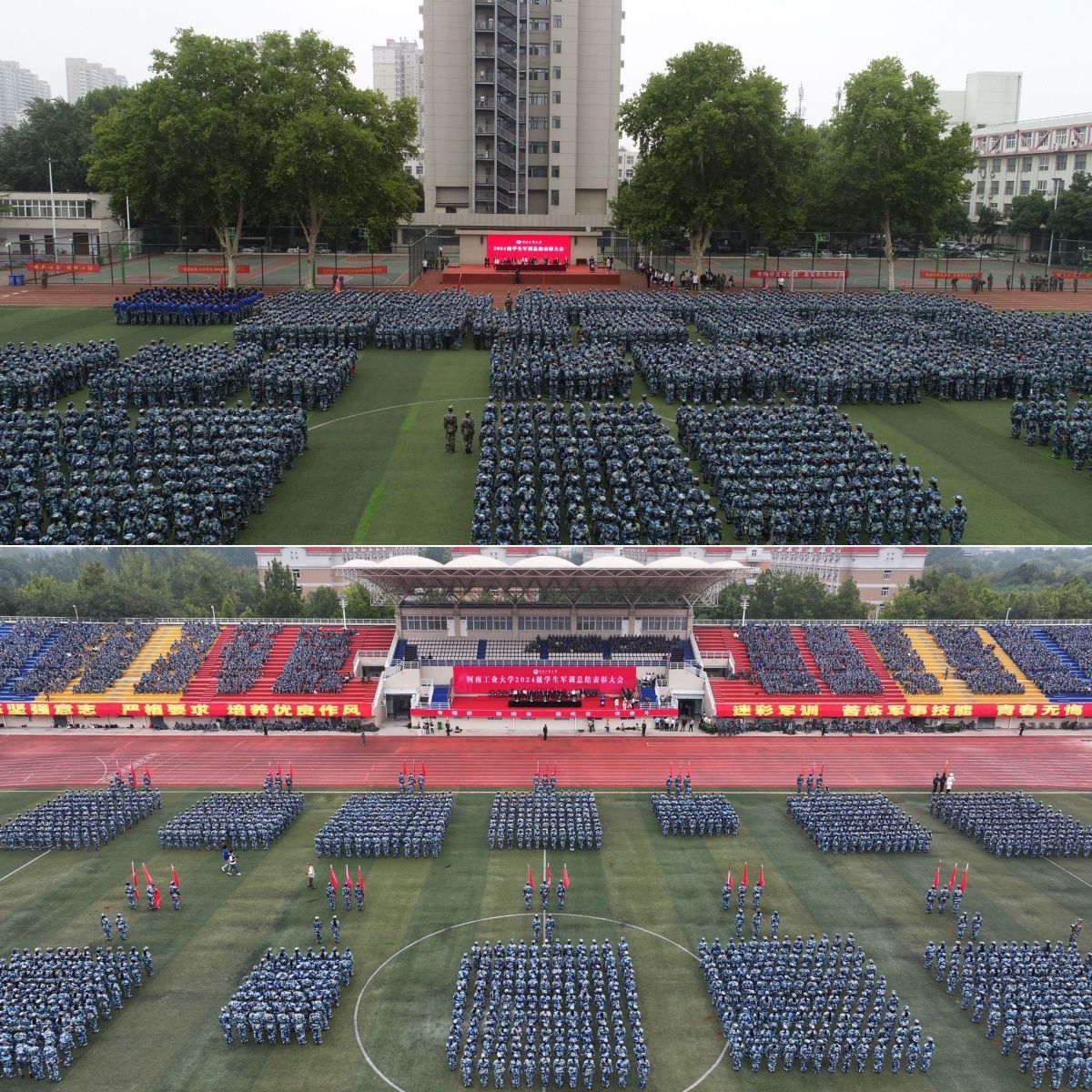 军训铸魂展青春,砥砺奋进谱华章。9月29日上午,我校2024级学生军训总结表彰大会分别在嵩山路校区和莲花街校区隆重举行。全体校领导、中原区人民武装部部长杨金波出席表彰大会,各职能部门、各学院(书院)主要负责同志、2024级新生辅导员和班主任代表、军训教官、全体2024级新生参加总结表彰大会。学工部部长、武装部部长王迪和校团委书记高泉分别主持表彰大会。