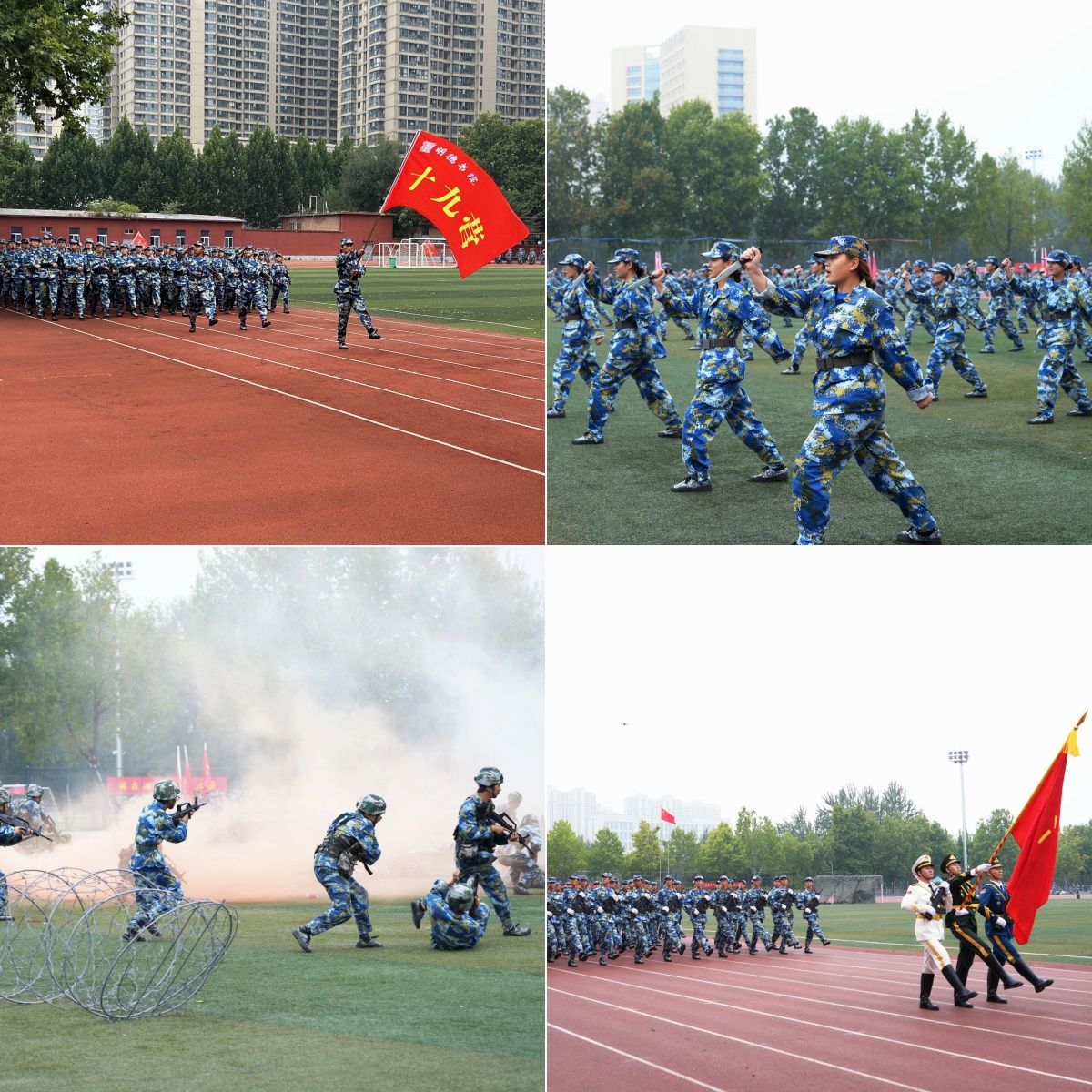 大会伊始,校党委书记刘志军和校长吴智深分别在嵩山路校区和莲花街校区宣布军训表彰大会开始。近9000名新生身着迷彩戎装,军容严整、斗志昂扬、英姿飒爽,带来了军体拳、擒敌拳、匕首操、应急棍术等精彩表演,展现了大学生朝气蓬勃、自信自强、坚韧不拔、昂扬向上的良好形象。军体拳表演刚劲有力、干净利落、动作精练、热血激扬,彰显刚毅不屈的英雄气概。战术表演编排精彩、跌宕起伏,迫击炮射击、人质营救等模拟战场,狼烟滚滚,让人仿佛身临其境,一攻一防尽显血性胆气。女生组成的匕首操方阵,动作行云流水,气势磅礴震撼,一招一式打出巾帼不让须眉的豪气。分列式上,各学院方阵列队整齐、步伐坚定、身姿挺拔、神情坚毅、口号嘹亮,依次通过主席台接受检阅,展现了我校学子青春洋溢、蓬勃向上的精神风貌,赢得了在场师生的阵阵掌声。