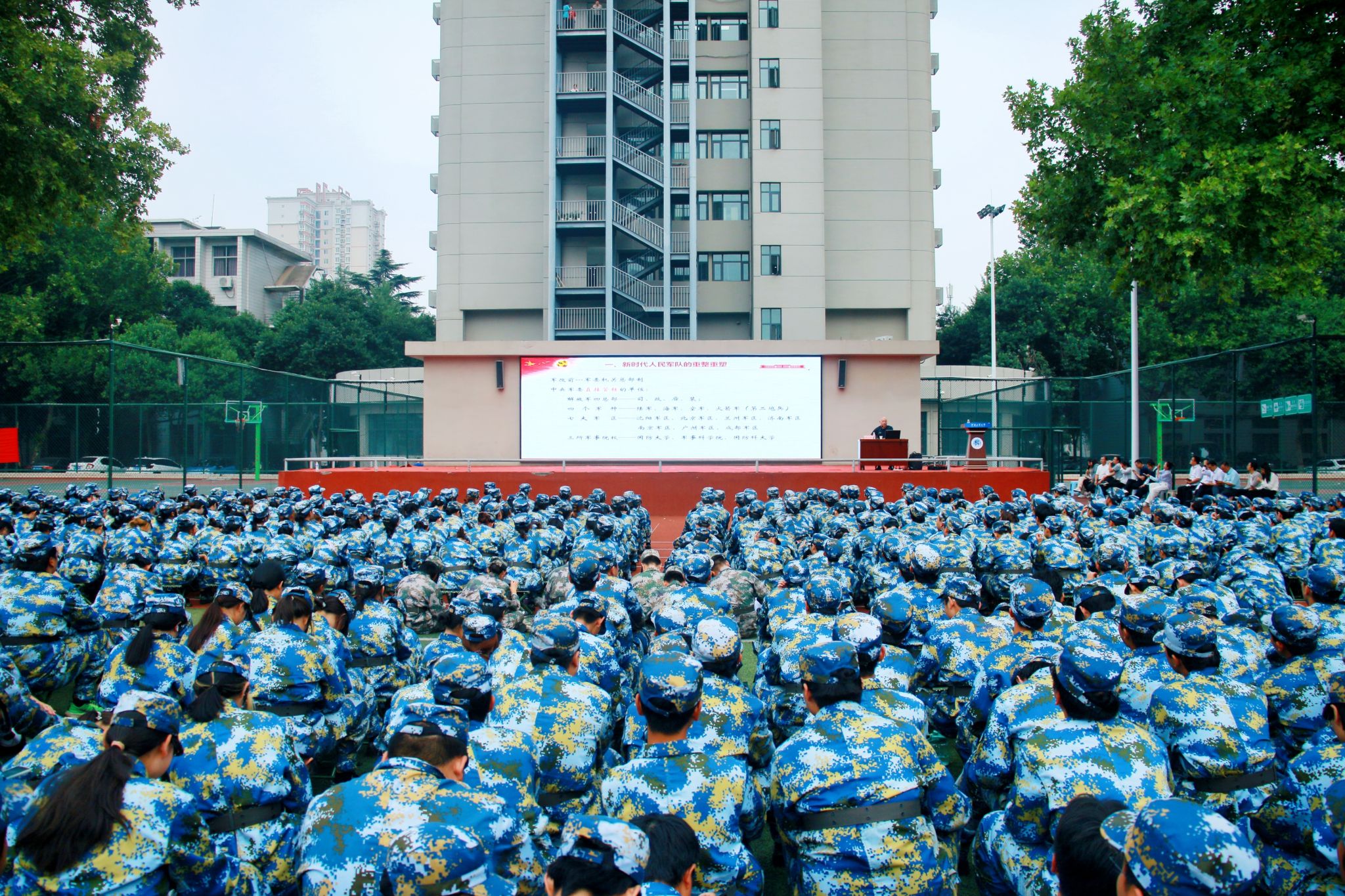 踔厉奋发强国防,勇毅前行向复兴。为深入学习贯彻习近平新时代中国特色社会主义思想和习近平强军思想,贯彻落实《中华人民共和国国防教育法》,增强学生国防观念和国家安全意识,9月29日下午,我校在嵩山路校区体育场举办“国防教育大讲堂”第二期——“回顾海军发展历程 投身强国强军伟业”专题报告会。本期主讲嘉宾为梁春晖,海军退役大校,军事科学院军事学博士。党委学生工作部、武装部、校团委、明德书院负责同志及书院教师代表、2024级学生3800余人现场聆听。活动由河南工业大学学工部部长王迪主持。