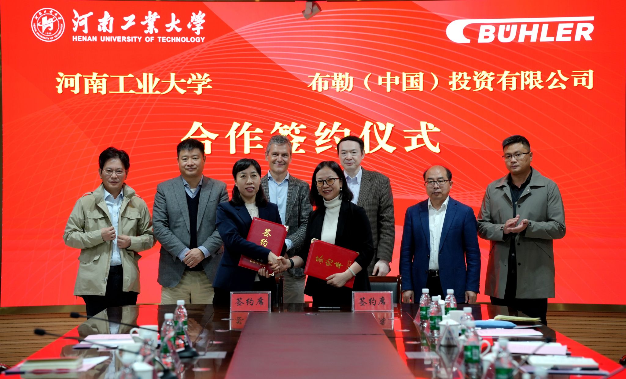 签约仪式上,白艳红、何军慧分别代表双方签署战略合作协议,赵仁勇、张恒达分别代表河南工业大学和布勒(无锡)商业有限公司签署技术开发(合作)协议。