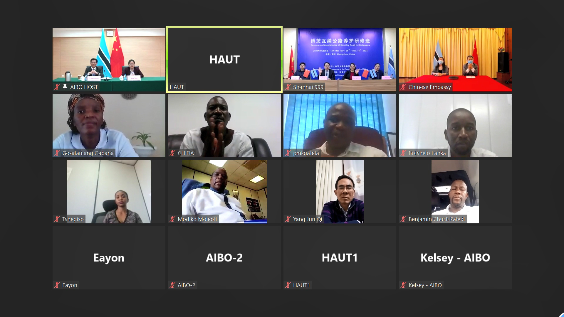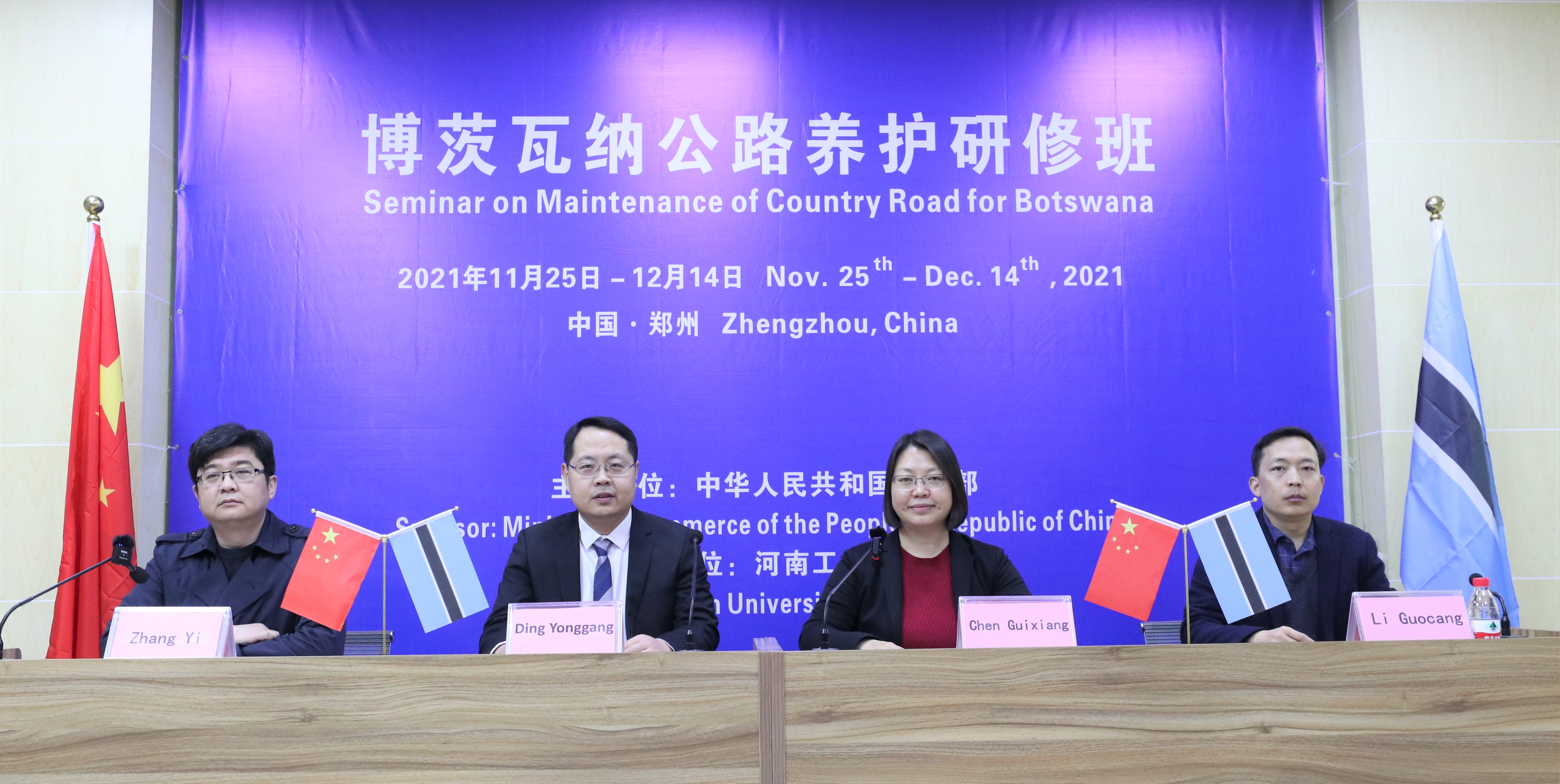 12月14日,由中华人民共和国商务部主办,河南工业大学承办的司处级“博茨瓦纳公路养护研修班”顺利结班,结业典礼通过线上形式在中国北京、河南郑州和博茨瓦纳首都哈博罗内三地同时进行。中国驻博茨瓦纳大使馆经济商务处参赞杨迅雷、商务部国际官员研修学院副院长陈润云、河南省商务厅外经处副处长杨军岐、商务部国际官员研修学院项目管理处副处长韩宁,河南工业大学副校长陈桂香、土木工程学院院长丁永刚、远程与继续教育学院副院长李国仓以及博茨瓦纳交通与信息部各司处级官员共同出席了结业典礼。