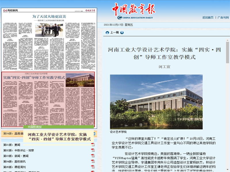 12月17日,《中国教育报》四版以半个彩版刊登报道《河南工业大学设计艺术学院:实施“四实·四创”导师工作室教学模式》,对我校设计艺术学院导师工作室教学模式改革过程和成效进行了深度报道。