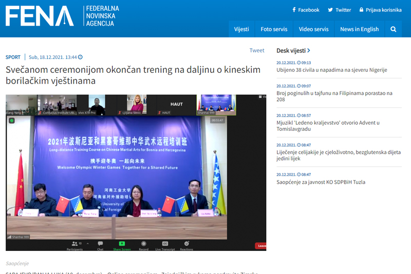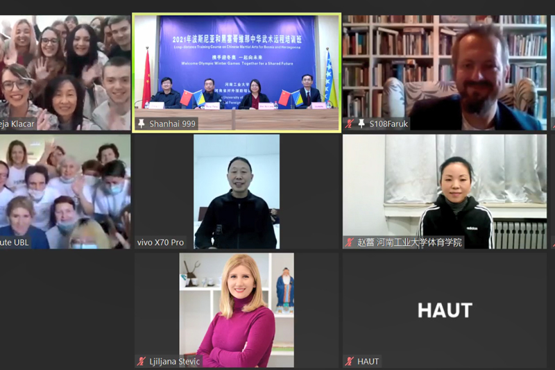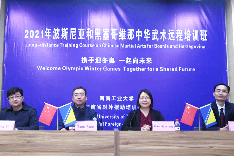 12月18日,由中华人民共和国驻波斯尼亚和黑塞哥维那大使馆、中共河南省委外事工作委员会办公室和河南工业大学联合主办的波黑中华武术远程培训班”结班典礼,在中国郑州、波黑萨拉热窝、巴尼亚卢卡与东萨拉热窝四地同时举办。波黑—中国友好协会主席法鲁克·博里奇,《少林与太极》杂志社总编辑赵国华,河南工业大学副校长陈桂香,波黑巴尼亚卢卡大学孔子学院外方院长李莲娜·斯特维奇,波黑东萨拉热窝大学代表涂寻,波黑萨拉热窝大学孔子学院代表杨福亮,乐鱼online(中国)远程与继续教育学院院长刘克非、体育学院副院长王放、河南省对外援助培训中心主任张翼以及培训班教练员、波黑三所大学师生代表共同出席结业典礼。