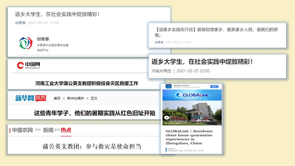 2021年,在校党委的正确领导下,在各级共青团系统精心组织、认真谋划下,以“永远跟党走、奋进新时代”为主题,派出4支国家级重点实践团队、6支省级重点实践团队、2065支校级实践团队,共16000余名师生参与活动。全校继续坚持“专业引领,学践并行”的指导思想,围绕党史学习教育、理论宣讲、国情观察、乡村振兴、民族团结、黄河流域高质量发展与保护、社会治理7个实践专题,开展了丰富多彩的“三下乡”社会实践。各项品牌、团队共被国家级媒体报道300余篇,其中被团中央、中国青年报等重点媒体报道214篇,取得了良好的社会反响。在社会实践总结期间,团省委副书记李丽、青发部长李山英等到我校走访调研社会实践总结展,并给予了高度评价。