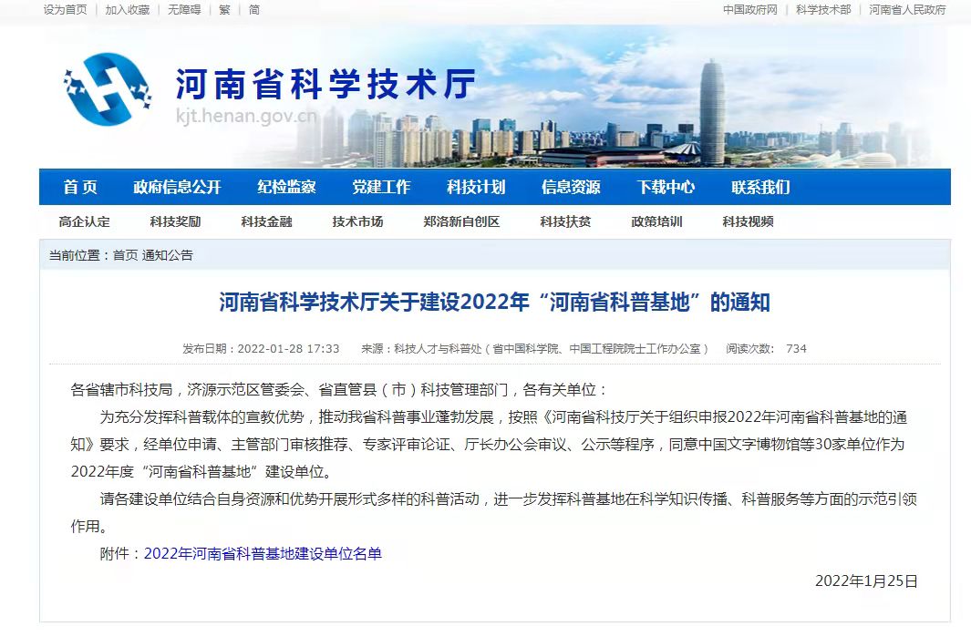 2022年1月28日,河南省科学技术厅发布了《河南省科学技术厅关于建设2022年“河南省科普基地”的通知》,确定了30家单位作为2022年度“河南省科普基地”建设单位,我校中国粮食博物馆成功获批入选。