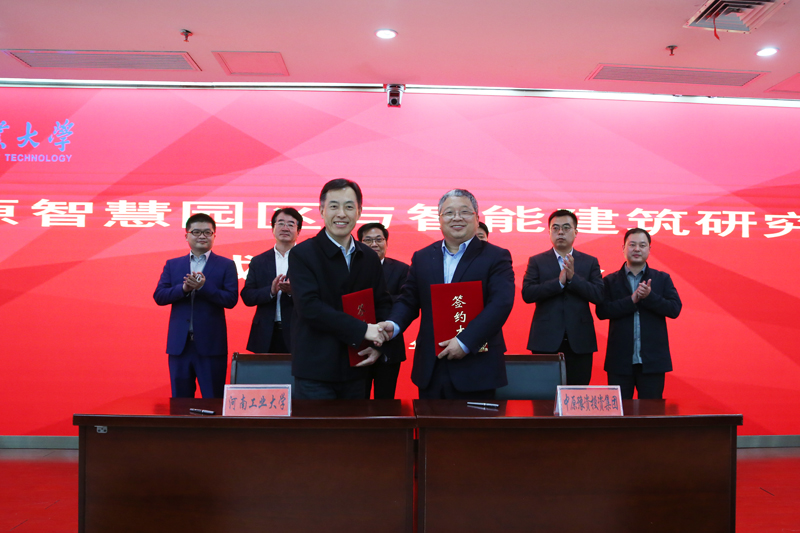 秦建斌、李成伟作为双方代表签署战略合作协议,并共同为中原智慧园区与智能建筑研究院揭牌。李成伟为秦建斌和李鹏分别颁发名誉院长聘书和院长聘书。科技处处长王晓曦为秦建斌、邹正浩、唐恒安、李海涛、严超5位同志颁发客座教授聘书。