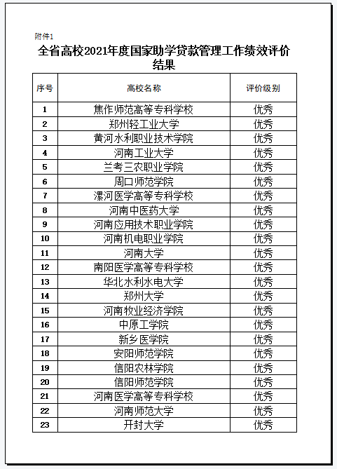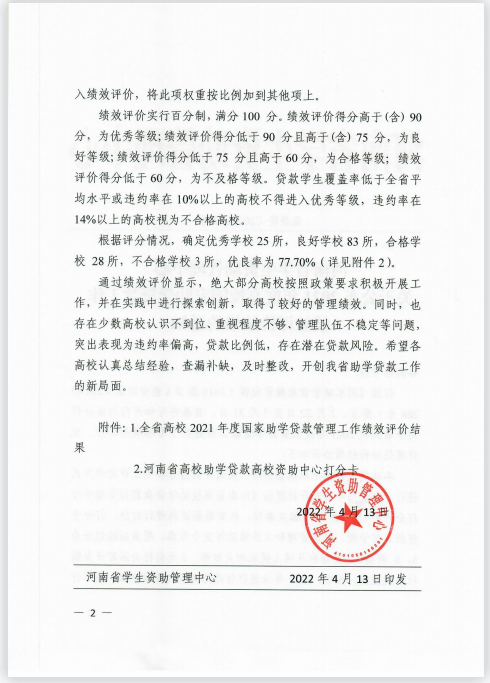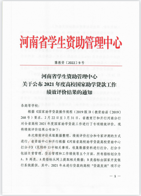 2022年2月至3月,河南省教育厅、国家开发银行河南省分行对全省高校2021年度国家助学贷款工作进行了专项绩效评价。近日,河南省学生资助管理中心下发《关于公布2021年度高校国家助学贷款工作绩效评价结果的通知》(豫教资〔2022〕9号),我校再次获得优秀等次。