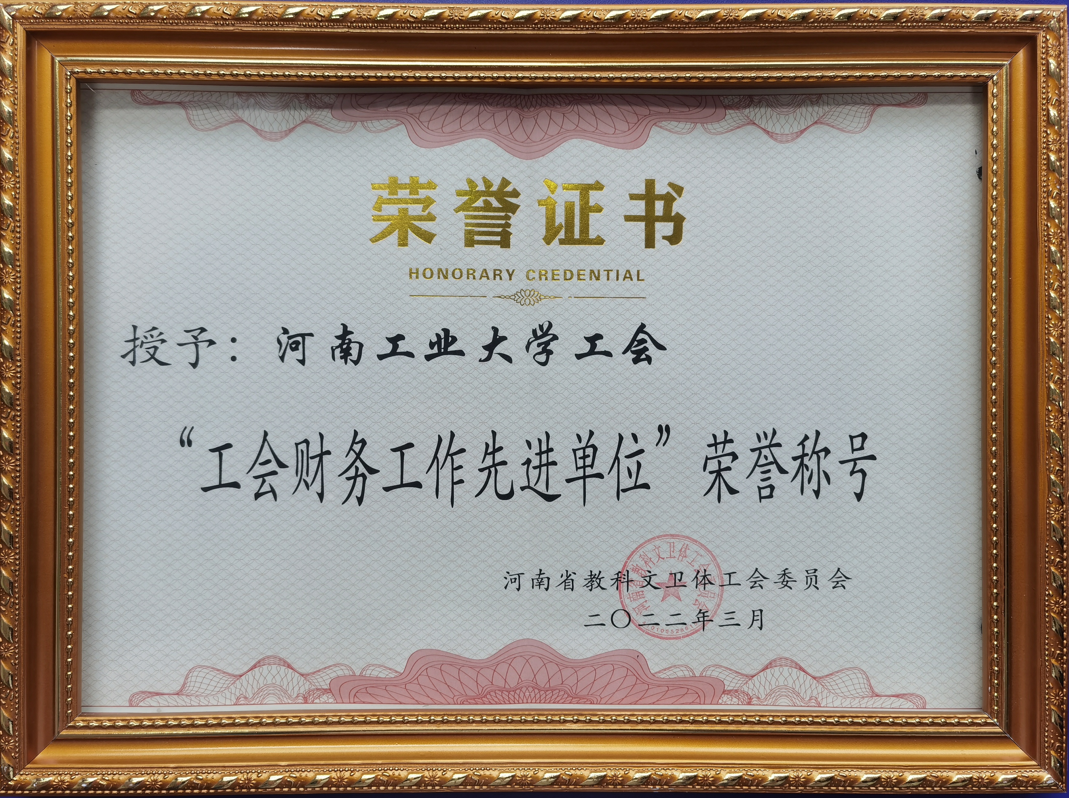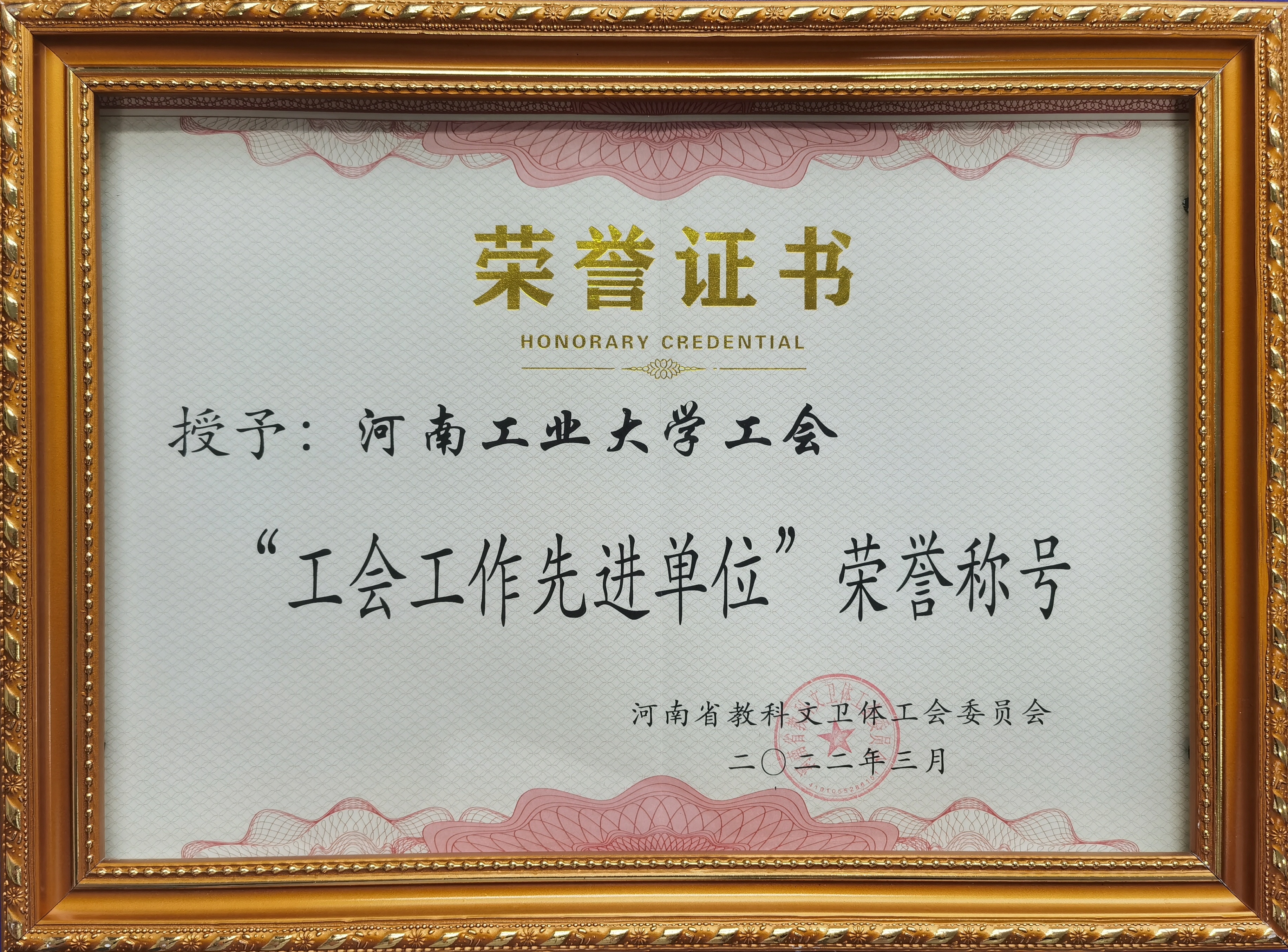 近日,河南省教科文卫体工会印发《关于表彰2021年度先进集体和先进个人的决定》(豫教科文卫体工[2022]5号),我校工会被授予“工会工作先进单位”,同时还获得“工会财务工作先进单位”称号。图书馆采编部和经济贸易学院金融学系荣获“女职工建功立业先进集体”称号,生物工程学院张璐等5名教职工荣获先进个人荣誉称号。