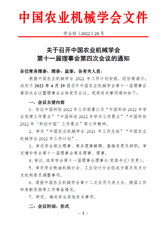 附:中国农业机械学会(Chinese Society for Agricultural Machinery,CSAM),成立于1963年3月,是中国科学技术协会所属全国学会,是我国农业机械和工程领域科技工作者及相关单位自愿组成的全国性、非营利性社会团体,挂靠在中国农业机械化科学研究院。