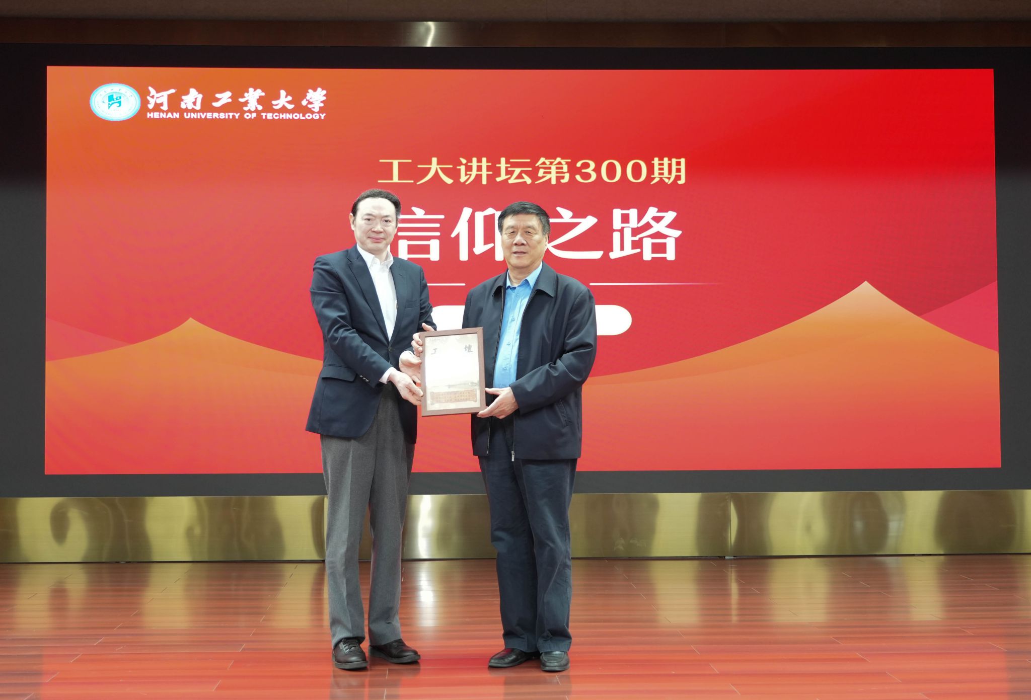讲座伊始,校长吴智深向朱和平将军赠送工大讲坛纪念海报。