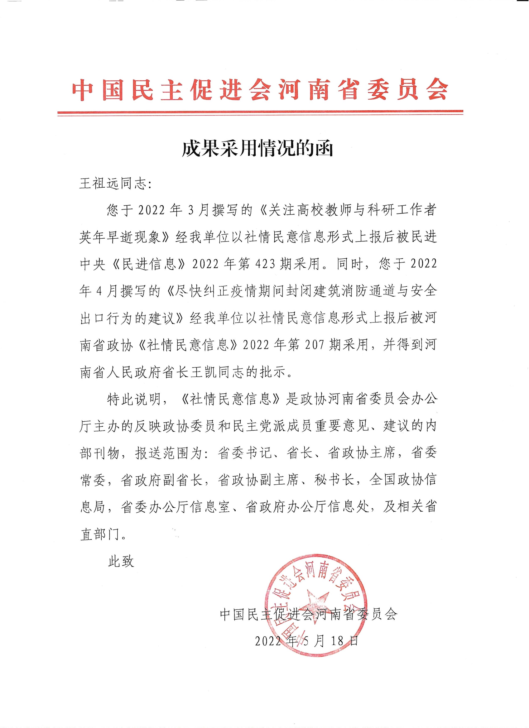 近日,民进河南工业大学支部副主委、土木工程(建筑)学院副教授王祖远撰写的《关于尽快纠正疫情期间违法封闭建筑消防通道与安全出口的建议》,经民进河南省委会以社情民意信息形式上报后被省政协《社情民意信息》采用,并得到河南省人民政府省长王凯同志批示。