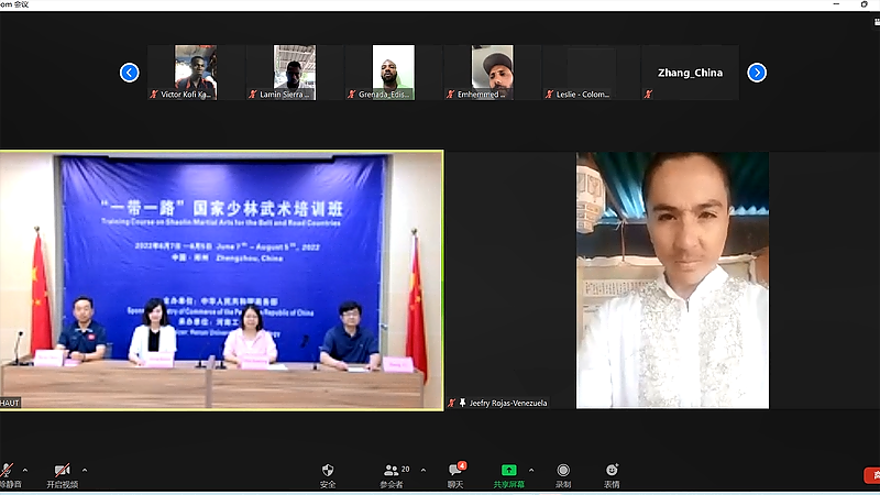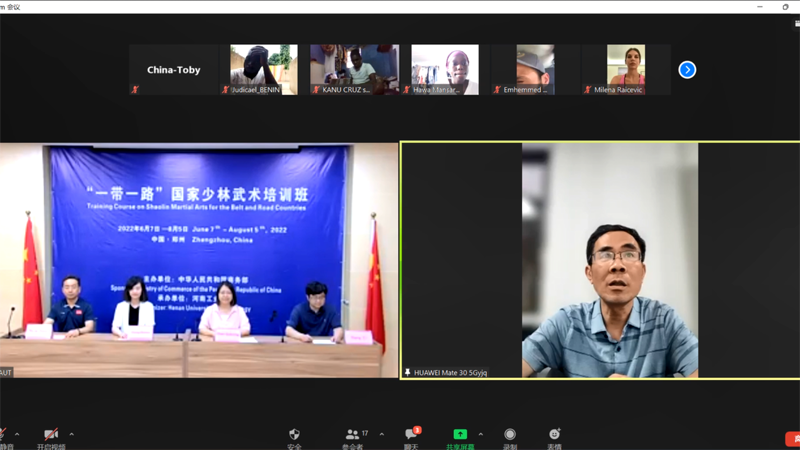 杨军岐代表河南省商务厅外经处致辞。他指出,近年来,河南省着眼文明交流互鉴,积极推进中华武术“走向世界”,尤其是2019年以来,河南省援外培训中心聚合河南工业大学办学优势,充分发挥少林和太极两张武术名片优势,成功在格林纳达、拉脱维亚、波黑等地举办多期线上武术培训活动,培训成效获得新华社海外网、人民日报海外网、学习强国以及受援国家媒体、平台报道宣传,境外培训的成功举办在海外引起很大反响,受到驻国外使领馆的高度评价。