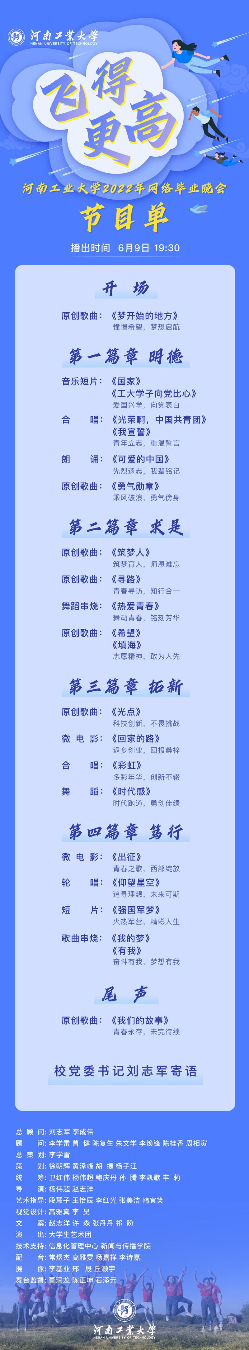 乐鱼online(中国)党委高度重视今年的网络毕业晚会。校党委刘志军书记为晚会录制寄语,李学雷副书记带领有关部门同志两次审核晚会内容,确保晚会完美呈现。今年,是我校三年来第二次以网络毕业晚会的形式送别毕业生,该晚会由校团委主办,大学生艺术团、大学生广播站出演,党委宣传部、学生工作部、校工会、招生工作办公室、信息化管理中心、社会合作与校友办公室、新闻与传播学院、设计艺术学院、体育学院等共同参与创作。