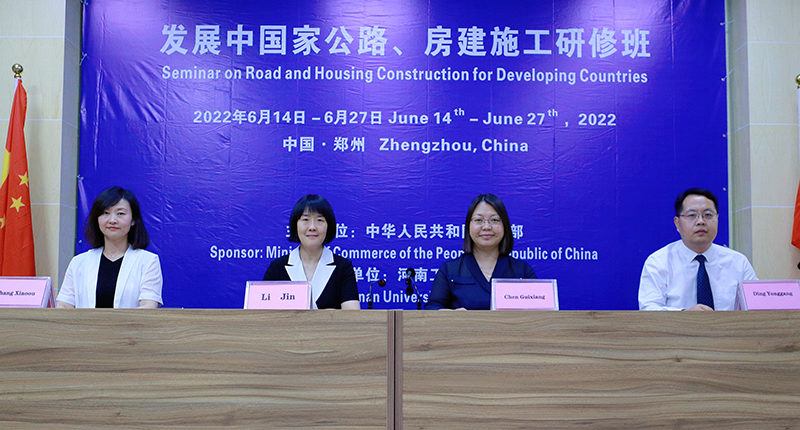 陈桂香代表河南工业大学致欢迎词。她指出,近年来,河南工业大学依托河南省对外援助培训中心,通过举办培训班、研修班,在路桥建设、工程管理、施工技术、设计养护等方面先后为亚洲、非洲、北美洲多个国家培训交通部门政府官员、管理人员和技术人员200多人次。为在疫情防控期间高质量举办好本次研修班,河南省对外援助培训中心会同土木工程学院等单位精心设计培训方案、高标准遴选授课师资、多环节考虑授课方式,以期通过为期14天的专题培训,尽力帮助参训学员在学习中国公路、中国房建成功经验的同时,能够使其为所在国家公路、房建发展做出更大贡献,同时也为共同探索解决“一带一路”沿线其他不同国家的公路、房建问题贡献中国智慧、提供中国方案,努力实现路路畅通、房屋适居的共同梦想。