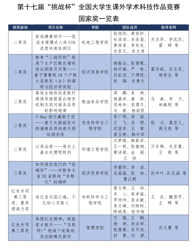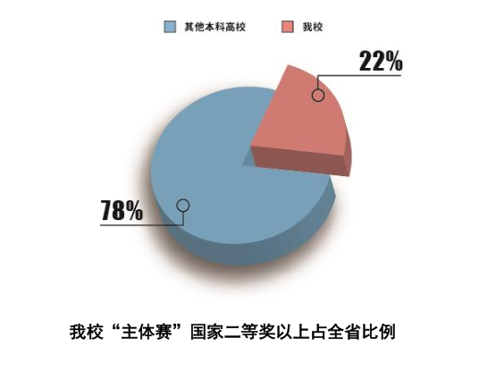 据统计,此次大赛我校国家奖数量在省内本科高校名列前茅。“挑战杯主体赛”国家奖占全省本科高校的16%,其中二等奖以上获奖占全省22%。