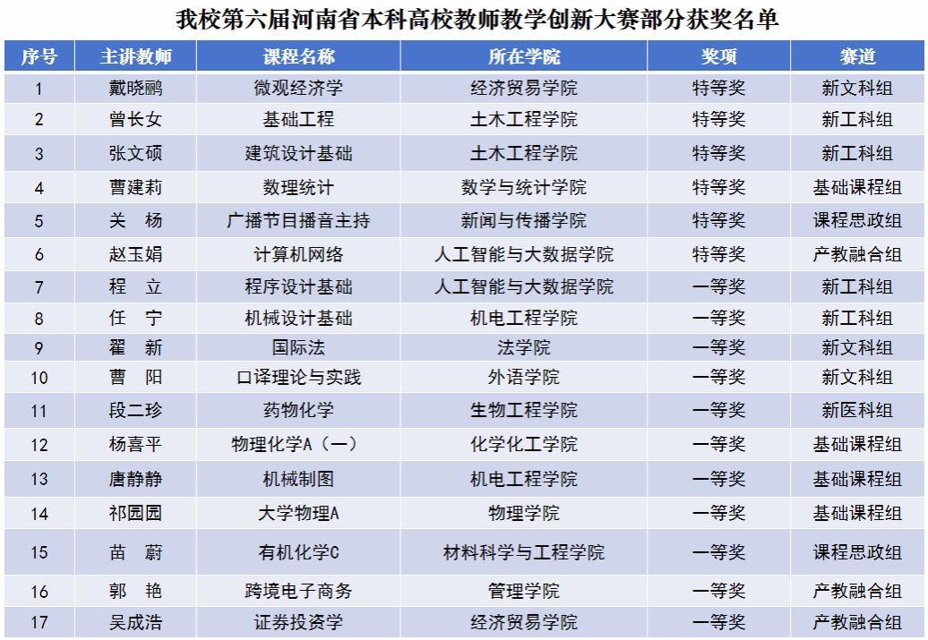 6月10日,省教育厅公布《第六届河南省本科高校教师课堂教学创新大赛获奖名单的通知》(教高〔2025〕131 号),我校荣获特等奖6项,一等奖11项,二等奖3项。我校获特等奖人数位居全省高校首位,获奖层次和数量再创新高,充分彰显了乐鱼online(中国)在教育教学创新领域的领先实力和丰硕成果。