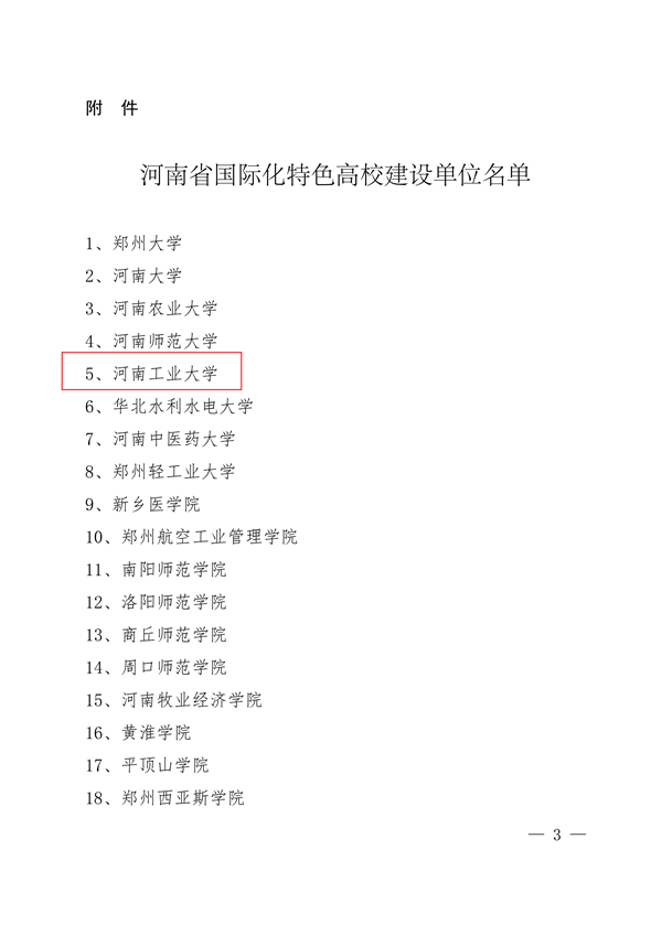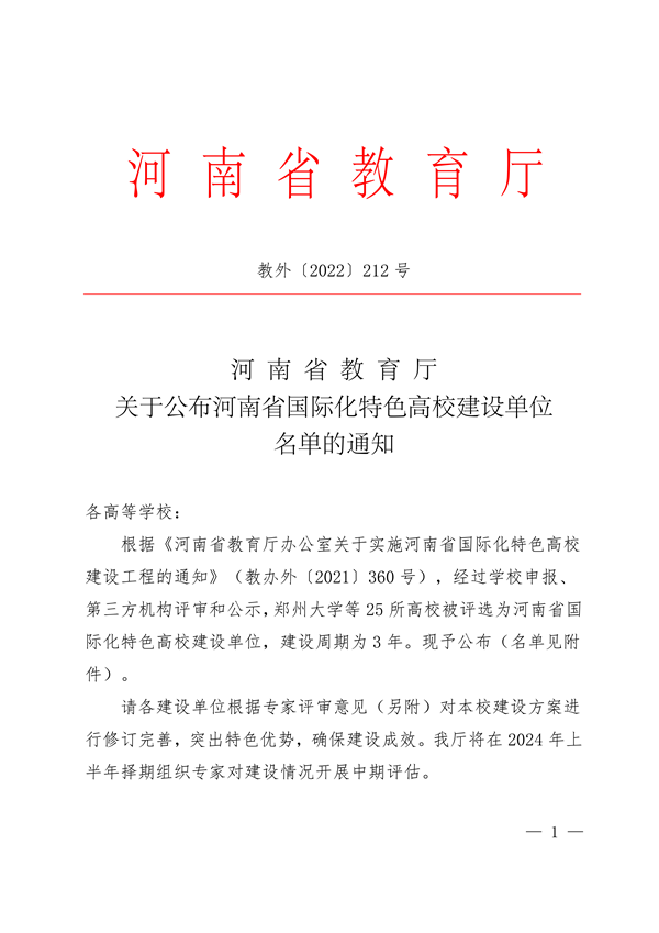 近日,河南省教育厅下发了《关于公布河南省国际化特色高校建设单位名单的通知》(教外〔2022〕212 号),基于高校申报、第三方机构评审,教育厅认定25所高校作为河南省国际化特色高校建设单位,我校成功入选。