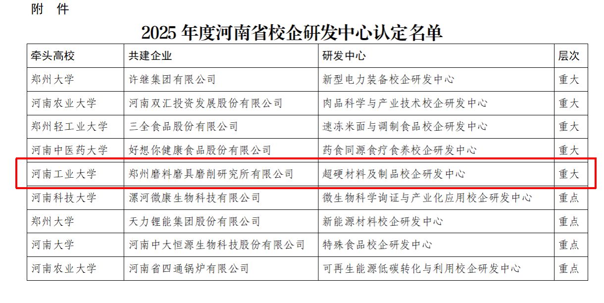 近日,省教育厅、财政厅、科学技术厅、工业和信息化厅联合发布《关于公布2025年度河南省校企研发中心认定名单的通知》,我校“超硬材料及制品校企研发中心”获得河南省重大校企研发中心认定。本次我省共认定5个重大和4个重点层次的省校企研发中心,分别将给予不高于200万元、100万元的资金支持。