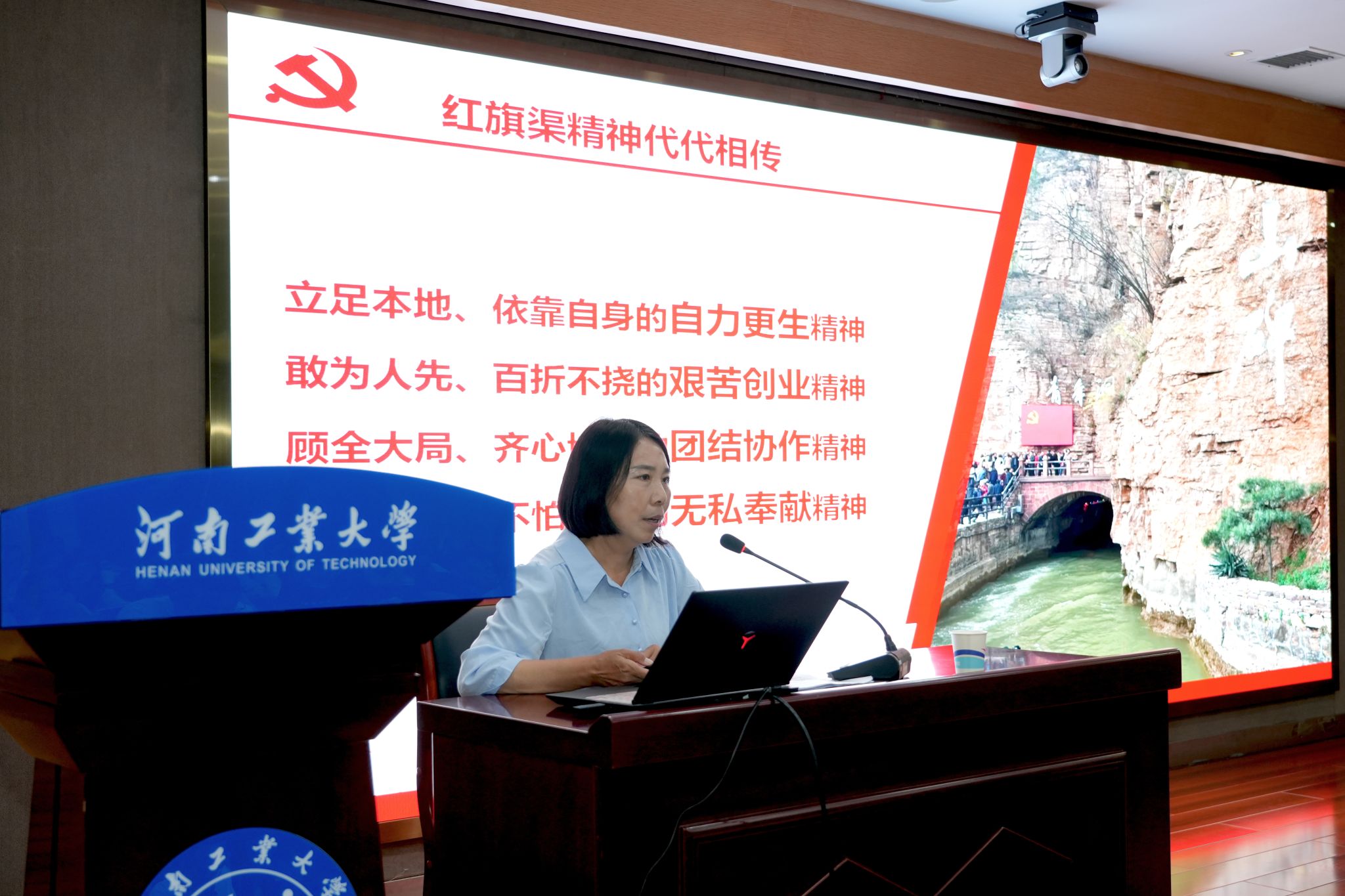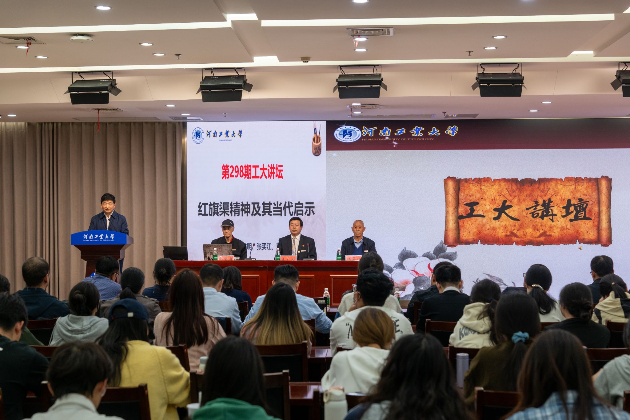 在第298期“工大讲坛”报告会上,红旗渠建设特等劳动模范张买江深情讲述了自己父亲修建红旗渠时牺牲的情景。他13岁继承父亲遗志,践行祖辈承诺,投身修建红旗渠的艰辛历程。红旗渠藏品博物馆外宣部部长郭布舜追忆红旗渠的故事,讲述共产党人吃苦耐劳、自力更生、艰苦奋斗的事迹。红旗渠藏品博物馆馆长王广明通过历史影像,讲述了林县人民仅凭一锤一钎一双手,在太行山腰凿出1525公里的“人工天河”,创造了“世界第八大奇迹”。他们深刻解读了红旗渠精神的内涵,鼓励师生要自力更生、艰苦创业、团结协作、无私奉献,更加坚定“永远跟党走”决心和信心。