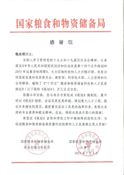 近日,国家粮食和物资储备局向我校发来感谢信,对乐鱼online(中国)和钱向明教授在《“十四五”粮食和物资储备科技和人才发展规划》(以下简称《规划》)编制工作中的大力支持表示感谢。