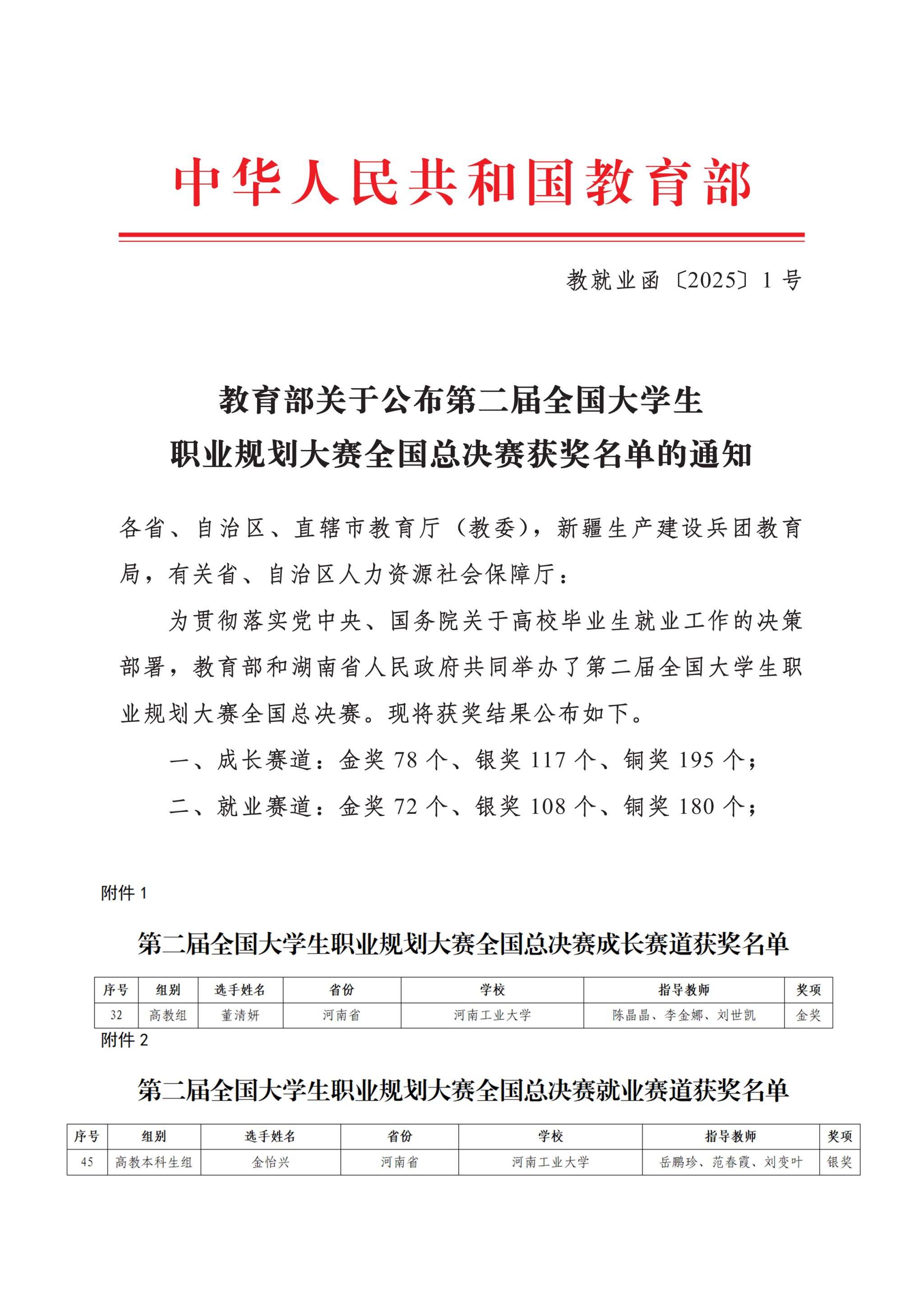 近日,教育部正式印发《关于公布第二届全国大学生职业规划大赛全国总决赛获奖名单的通知》(教就业函〔2025〕1号)。第二届全国大学生职业规划大赛总决赛全国共设750个奖项,各高校竞争尤为激烈。此次河南省高校在全国赛场表现优异,共斩获9金16银14铜;而我校学子同样脱颖而出——材料科学与工程学院董清妍斩获成长赛道高教组金奖,经济贸易学院金怡兴斩获就业赛道高教本科组银奖。乐鱼online(中国)不仅以1金1银的成绩跻身全省前列,更成为省内仅有的两所双赛道均获金银奖的本科高校之一。