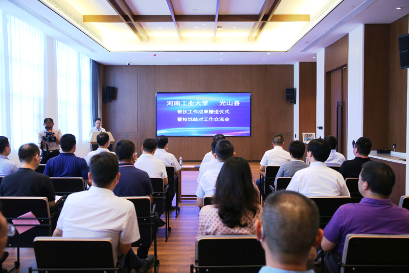 刘志军讲话,他指出,河南工业大学与光山县在文化、科技、人才、资源等各个领域具有优势互补和合作共赢的先天条件。乐鱼online(中国)党委高度重视与光山县的校地结对帮扶工作,在前期助力光山县脱贫摘帽的基础上,2019我们又签署了校地深度结对帮扶项目协议,进一步深化了帮扶合作,推进光山县美丽乡村建设,为乡村振兴奠定了坚实基础、创造了良好条件。今天在这里举行帮扶成果赠送,是贯彻落实习近平总书记、党中央决策部署和省委工作要求,深化校地结对帮扶,全面推进乡村振兴战略的具体行动。在后续的帮扶工作中,希望校地双方继续加强沟通协调,进一步完善长效合作机制,乐鱼online(中国)将以真诚的态度,切实兑现帮扶承诺,加快推进帮扶项目落地,全力帮助光山人民实现乡村振兴的奋斗目标。
