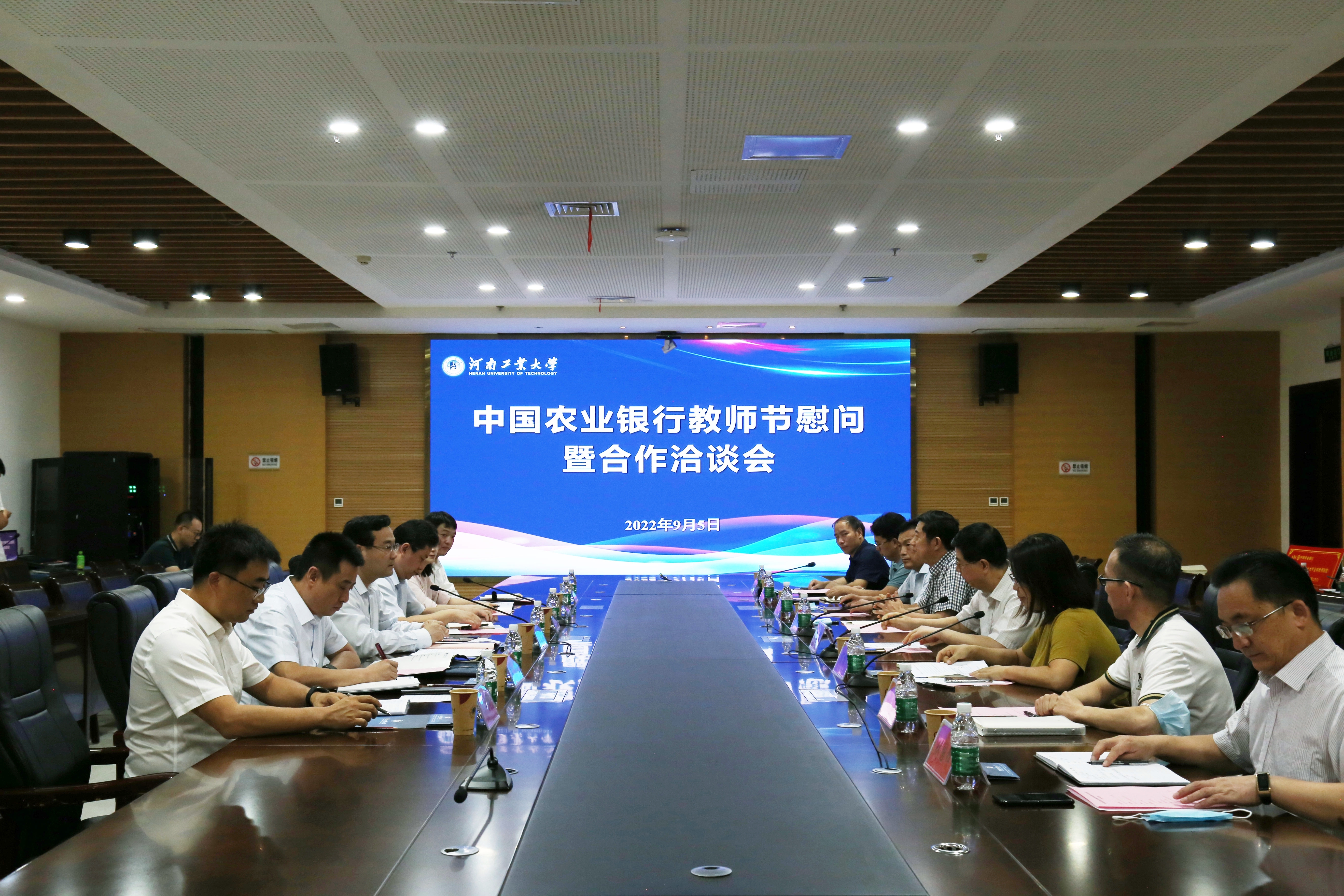 金秋送爽、丹桂飘香,值此第38个教师节来临之际,9月5日下午,中国农业银行河南省分行党委委员、副行长、郑州分行党委书记、行长曹复兴一行到我校进行教师节慰问及合作洽谈,会议在学术报告中心D204会议室举行,党委书记刘志军、副校长李焕锋、副校长陈桂香参加会谈,党办、财务处、国有资产管理办公室、实验室管理处、信息化管理中心等职能部门负责人参加会议。会议由陈桂香主持。