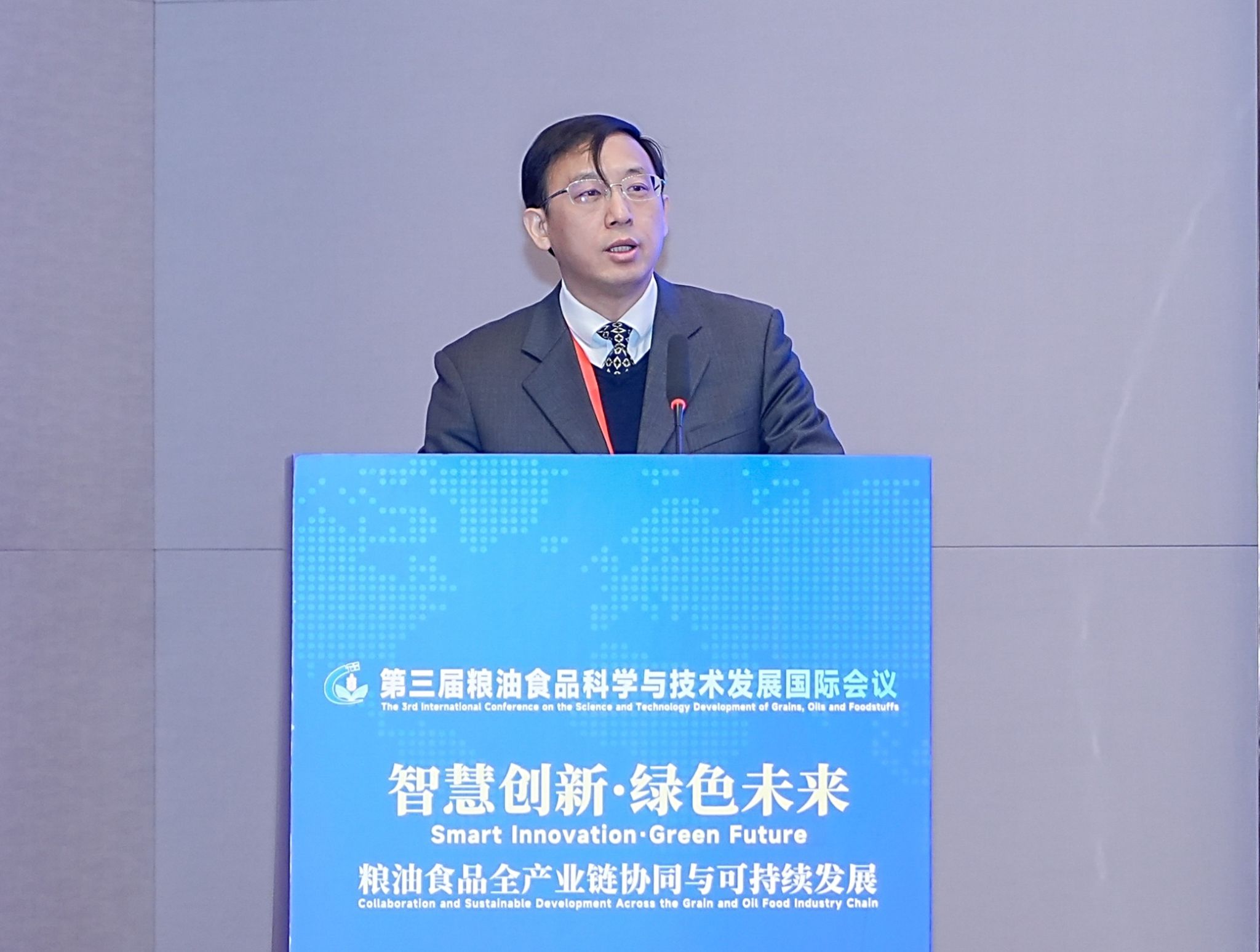 谭本刚代表共同主办单位向与会嘉宾致欢迎辞。他指出全球粮油食品产业面临气候变化、资源约束、食品安全等挑战,在这一背景下,国际社会比任何时候都更需要团结协作、通过本次国际会议凝聚共识、共享技术成果。