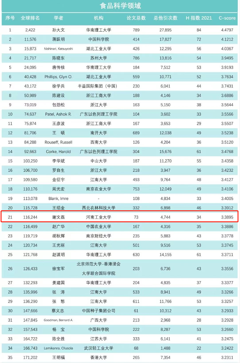 据悉,全球前2%顶尖科学家榜单由斯坦福大学John P. A. Ioannidis教授团队与Elsevier旗下Mendeley Data合作发布,分为“职业生涯影响力排行榜(Career)”和“年度科学影响力排行榜(Singleyr)”两个榜单,其中“职业生涯影响力排行榜”统计了科学家职业生涯期间的综合影响力表现,“年度科学影响力排行榜”反映了科学家上一年度的学术影响力。榜单以Scopus数据库为依据,基于学者研究成果的引用次数、H因子、Hm因子等综合指标,按照“生涯影响力”和“年度影响力”从全球近700万名科学家中遴选出世界排名前2%的科学家,涵盖数学、物理学、材料化学、化学、信息与通信工程、药学等22个领域和176个子学科。榜单数据提供了一个面向科学家长期科研表现的衡量指标,能够更客观、更真实地反映科学家的影响力。入选榜单,意味着该学者在其研究领域具有较高的世界影响力。谢文磊教授系河南省食品科学领域唯一入选“职业生涯影响力排行榜”的专家学者。