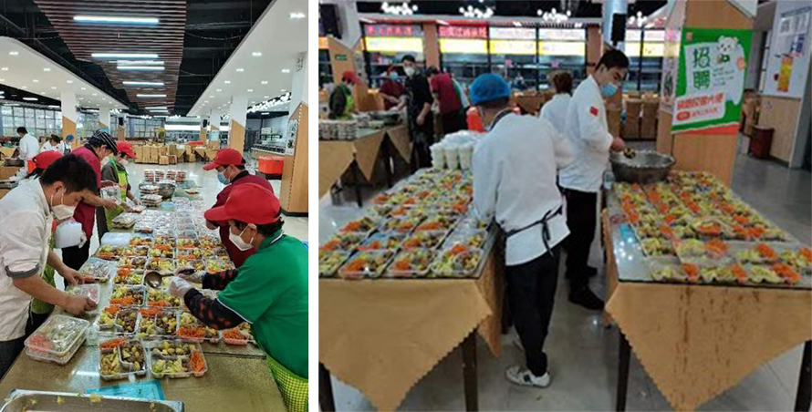 静默防控期间,学生集中在宿舍楼用餐,需要为各栋楼宇的师生配备盒饭及送餐。为保障师生生活用餐,乐鱼online(中国)食堂的师傅们每天起早贪黑,准备一日三餐,将数以万计的盒饭一个个装进保温箱,并及时配送到各个公寓楼下,热腾腾的饭菜温暖着在校的教职工和同学们,也连接着每个工大人的心。除了食堂的供餐人员,餐饮科管理人员也全身心地投入到了工作当中,每天清晨天未亮的时候,餐饮科管理人员及一线员工就已经奔赴岗位,开始检查饭菜供应情况和进行备餐工作;而到了夜深人静之时,餐厅依旧有他们忙碌的身影,检查水电气安全和打扫厨房卫生,安排第二天的餐食供应。