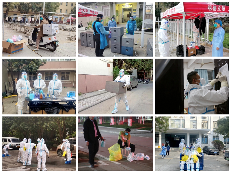 20多天的工作中,乐鱼online(中国)党员志愿服务突击队与嵩山路校区师生克服人员紧张、环境复杂、条件有限等诸多困难,共同筑起了“抗击疫情”的坚强防线:这里有每天研判分析到深夜的指挥中心党员干部;有彻夜统计数据、开展流调的老师;有不辞劳累深入宿舍做核酸检测的志愿者,有随时等候指令提供抗疫物资的物资保障组;有负责健康监测、分发三餐、物资配发、服务学生的一线楼长;有24小时待命负责隔离转运的党员突击队员;有通宵达旦做好基础保障的餐饮、保卫、保洁、消杀人员;有倾听学生声音、协助购买物资、开展心理疏导的辅导员。师生坚守、齐心协力,实现了嵩山路校区疫情防控形势的总体好转。