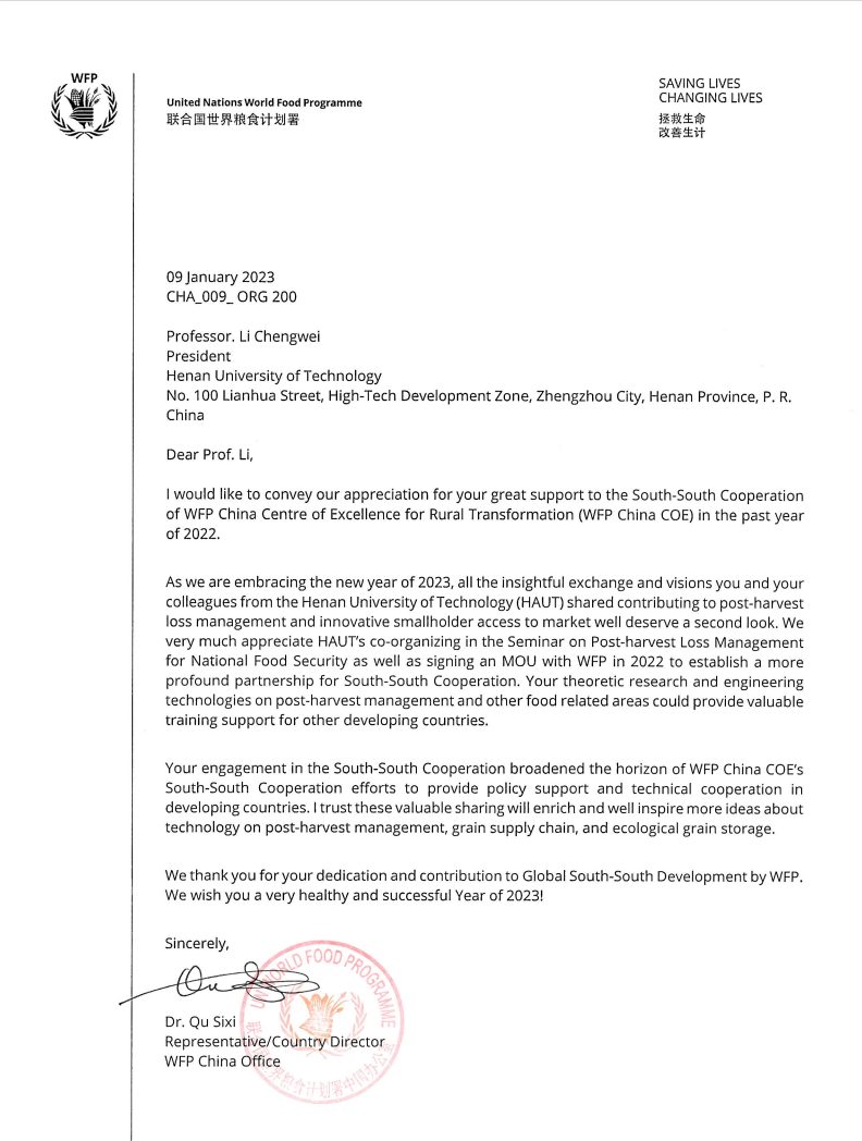 感谢信指出,一年来,李成伟和河南工业大学的专家教授在粮食产后损失管理和创新小农市场准入方面分享的独到见解和深远展望都值得回顾深思。世界粮食计划署非常感谢河南工业大学与世界粮食计划署共同举办“粮食减损管理与国家粮食安全研讨会”,建立深厚的南南合作伙伴关系。河南工业大学在粮食产后损失管理和其他粮食相关领域的理论研究和工程技术为众多发展中国家粮食培训提供了宝贵支持。
