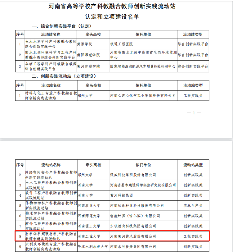 近日,河南省教育厅发布《河南省教育厅关于公布河南省本科高校产科教融合教师创新实践流动站建设的通知》教高【2023】112号,公布认定3所高校牵头申报的实践平台为教师综合实践创新平台和立项27 所高校牵头申报的流动站为教师创新实践流动站建设点的名单。我校申报的“材料学科超硬材料产科教融合教师创新实践流动站”获批。