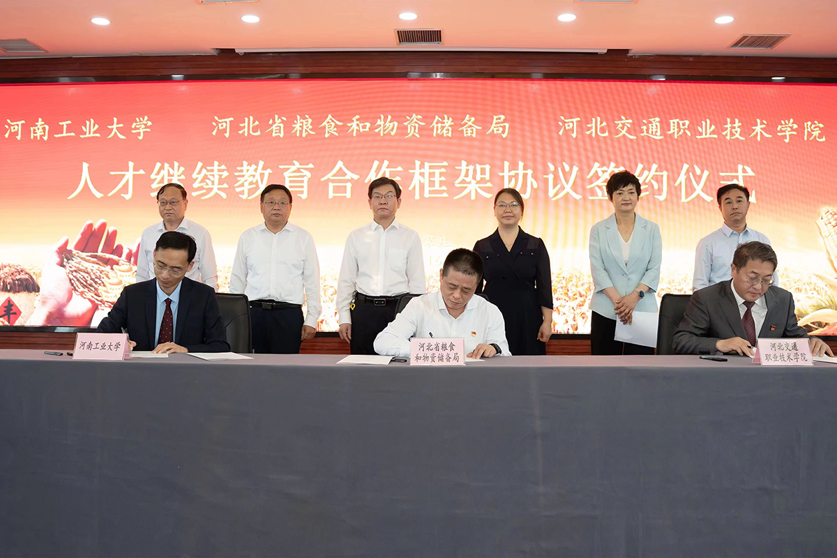 河北省粮食和物资储备局副局长刘志安、河南工业大学教育培训学院院长刘克非、河北交通职业技术学院继续教育中心主任申维新代表局校三方签订了人才继续教育合作框架协议。