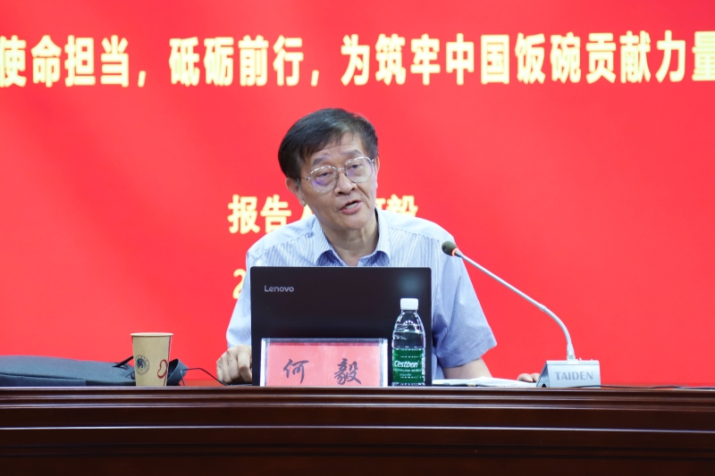 何毅总工从科技支撑是新时期国家粮食安全战略的明确要求、科技支撑在筑牢中国饭碗的历程中的作用以及科技支撑面临的挑战与期望三个方面为我们做了精彩报告。他强调,科技支撑是筑牢中国饭碗的基本保障,起着引导突破和可持续发展的作用,对破解难题、决策运筹帷幄有着定海神针的作用。他指出,粮食科技支撑还有许多“空白”与弱项,希望广大教师能够做到提高应对危机能力、融合协调能力、创新突破能力、克服困难能力、人才引领能力和成果转化能力,为筑牢中国饭碗、实现中国式现代化做出更大贡献。