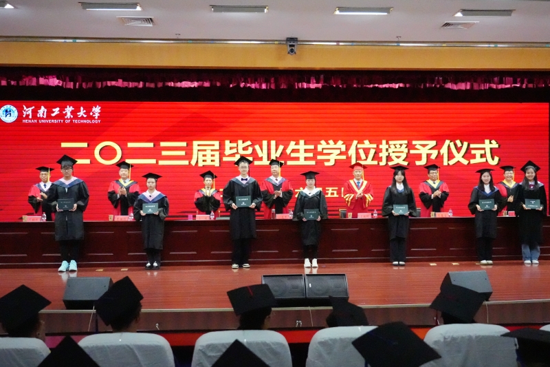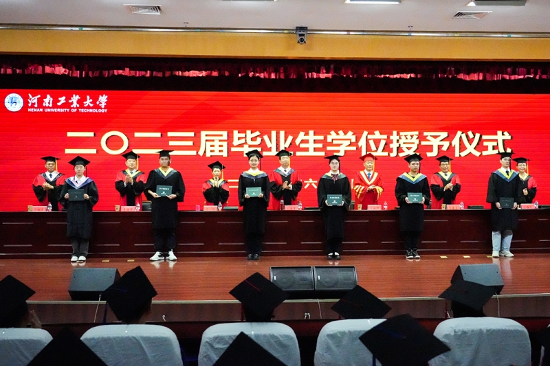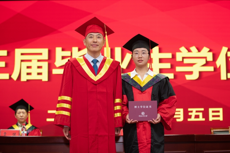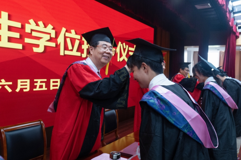 伴随着激昂振奋的校歌,校领导为获得学位的毕业生颁发学位证书、扶正流苏并合影留念。