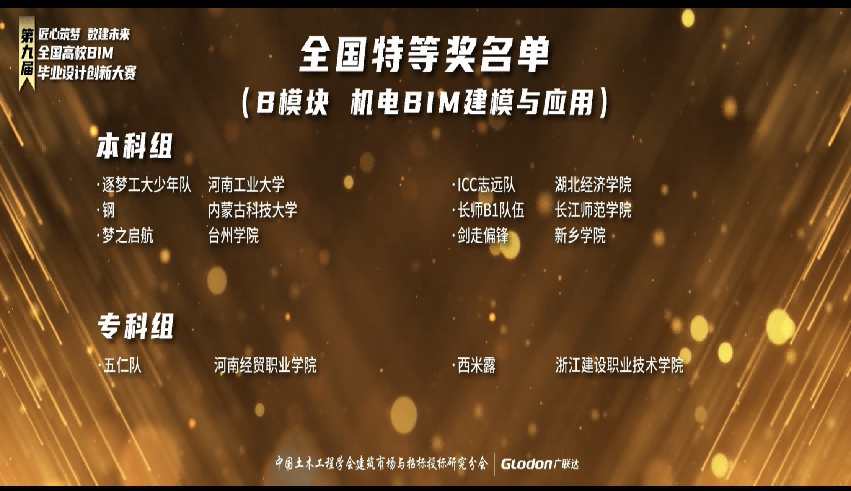 近日,由中国土木工程学会建筑市场与招标投标研究分会和广联达科技股份有限公司共同主办,东南大学、华南理工大学、北京交通大学、北京建筑大学承办的“第九届全国高校BIM毕业设计创新大赛”总决赛落下帷幕。我校土木工程学院(建筑学院)建筑环境与能源应用工程专业组成的参赛队伍成功进入全国总决赛,经过层层角逐,最终以全国最高分数斩获特等奖。