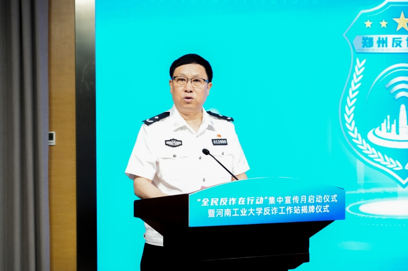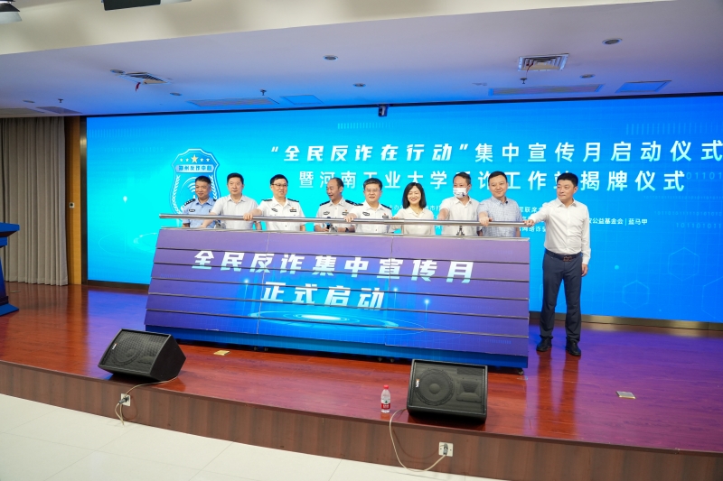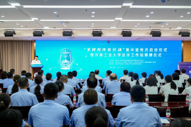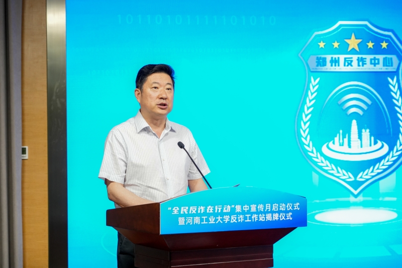 6月21日上午,郑州市“全民反诈在行动”集中宣传月启动仪式暨河南工业大学反诈工作站揭牌仪式在我校学术报告中心D205隆重举行。省公安厅电信诈骗犯罪侦查总队政委牛军生、郑州市公安局副局长何汝伟、共青团河南省委希望工程办公室主任申继东、交通银行河南省分行副行长王慧、市公安局犯罪侦查局副局长连广、蚂蚁集团区域总经理张耀翔出席启动仪式,副校长李焕锋出席并致辞,学工部、校团委、信息化管理中心、保卫处等部门负责人和师生代表参加仪式。郑州市公安局高新分局局长邱明升主持启动仪式。