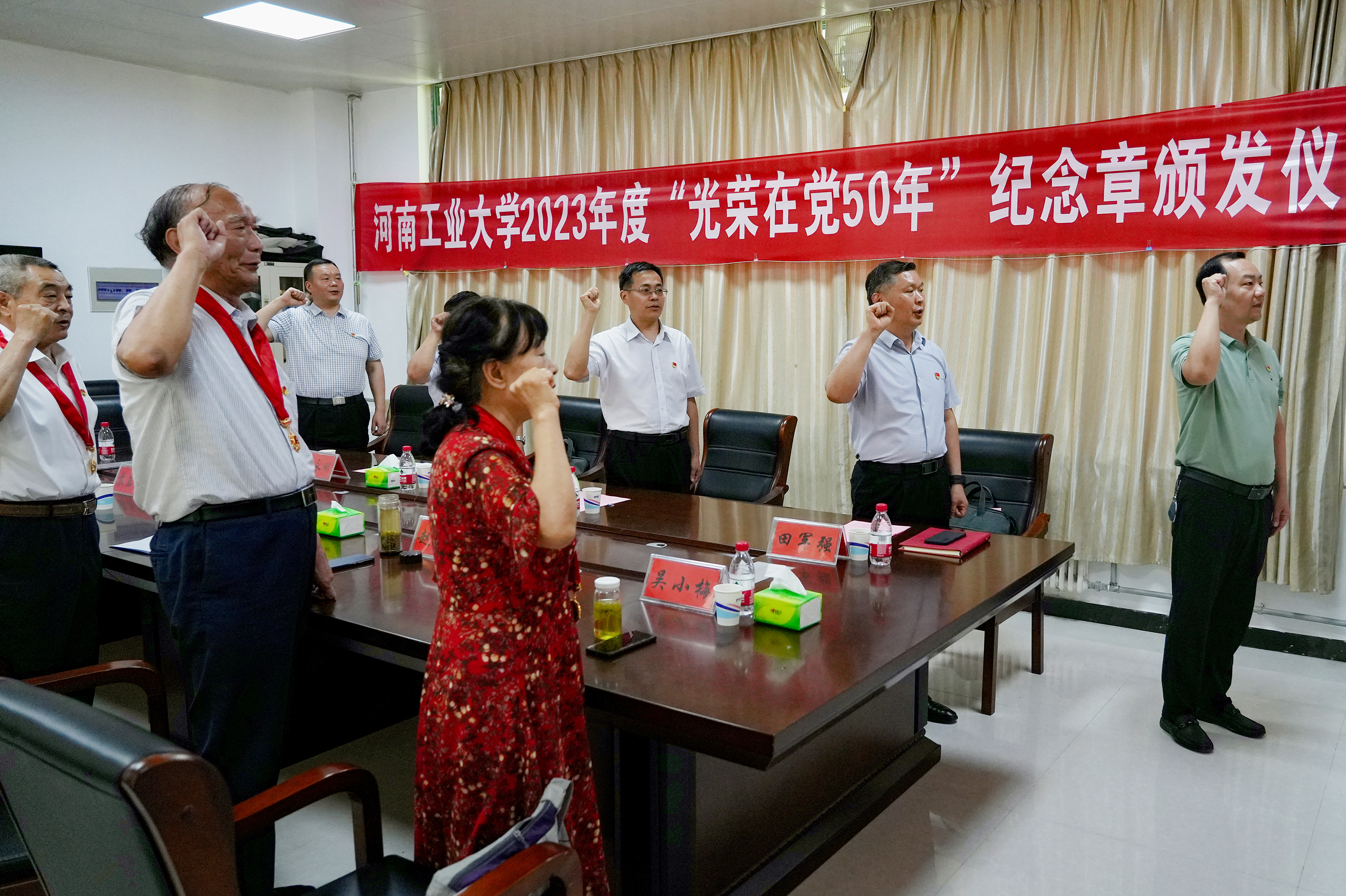 韩永刚宣读了我校2023年获此殊荣的5位老党员名单;随后,周相寅为5位党龄满50年的老党员颁发“光荣在党50年”纪念章。活动现场,在陆继勇的带领下,全体党员面对党旗,重温入党誓词,重忆入党初心。
