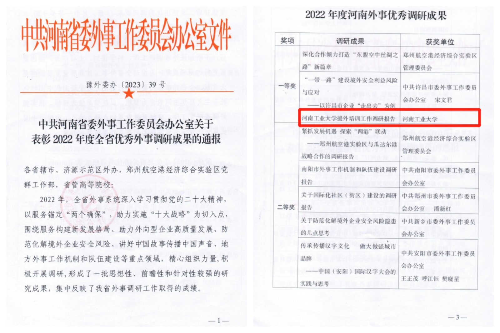 7月28日,中共河南省委外事工作委员会办公室下发了《关于表彰2022年度全省优秀外事调研成果的通报》(豫外委办〔2023〕39号),经过集体评审,我校提交的《河南工业大学援外培训工作调研报告》在此次调研成果征集活动中荣获一等奖。
