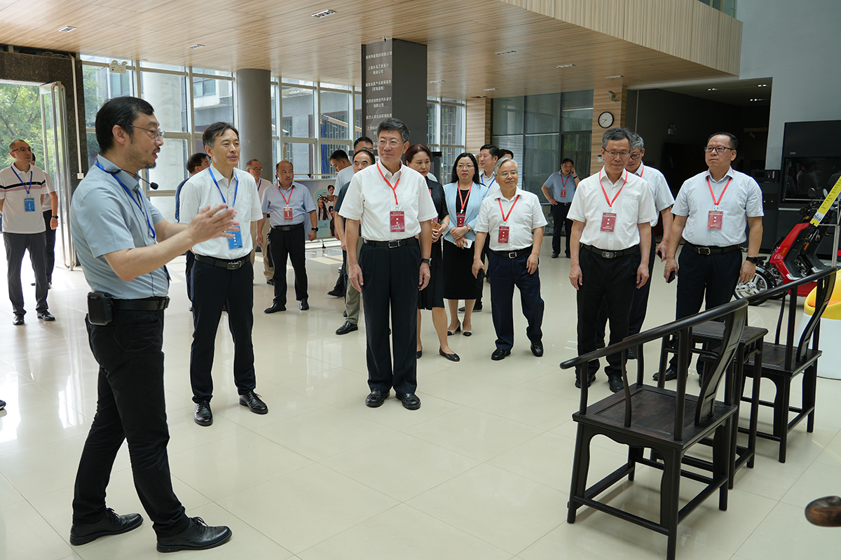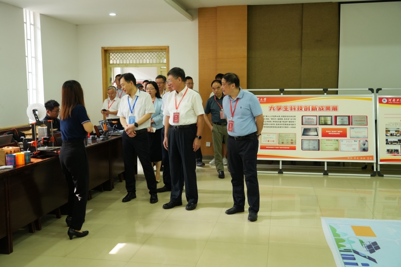 王庆斌带领专家组参观了在一楼大厅的校企合作毕业设计获奖作品、自主研发设计的倒三轮电动车、产学研合作家居设计成果展,二楼的视觉传达设计专业的通用信息设计工作室,三楼的河南省工业设计研究院、河南省工业设计中心、CMF设计实验室、人因工程实验室。专家组对设计艺术学院实施的导师工作室教学模式改革与成效,设计助力乡村振兴、及在“设计河南”建设中所做的努力和贡献给予高度评价。