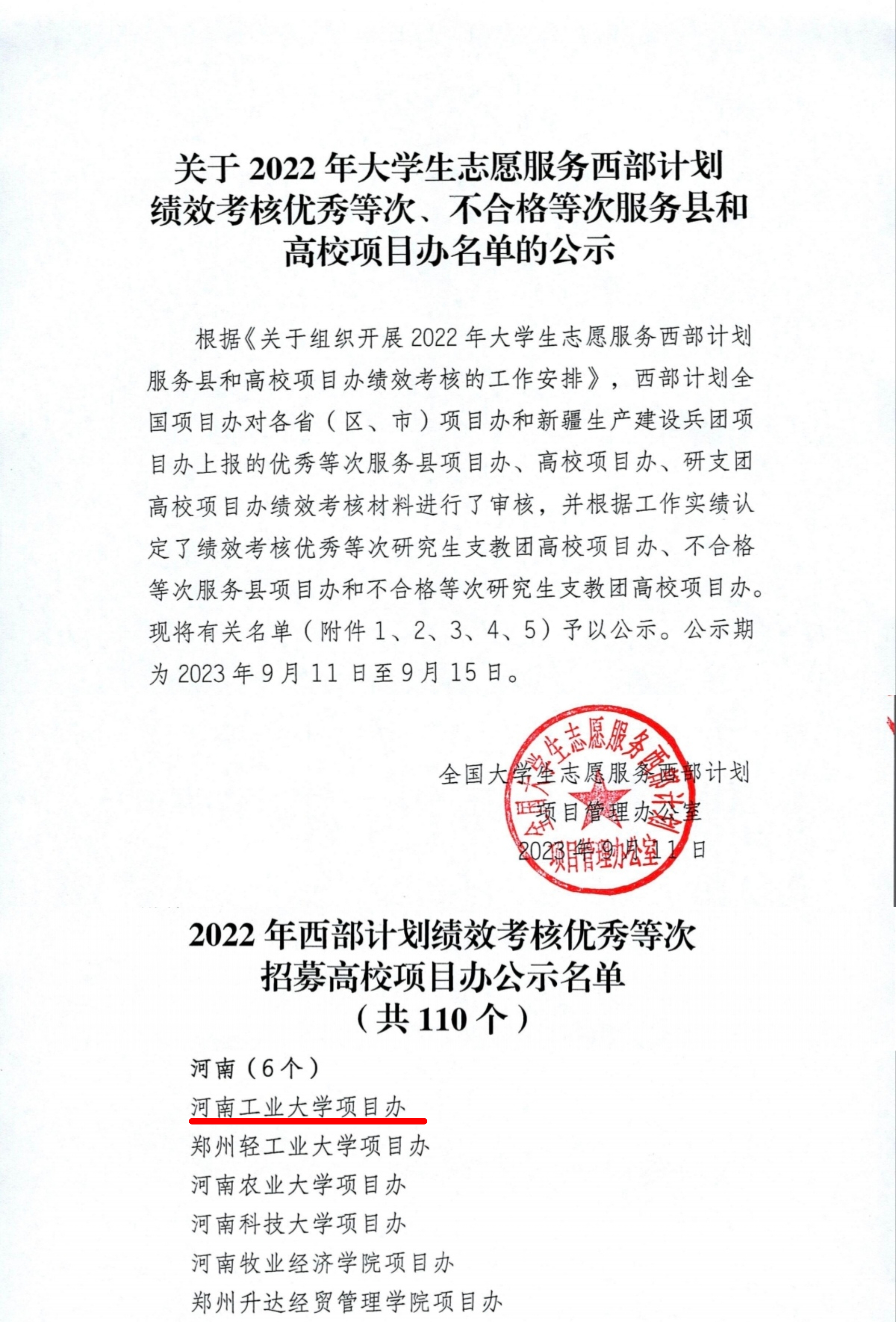 近日,共青团中央公布了全国高校志愿服务西部计划项目办绩效考核结果,我校(西部计划项目办)获评“2022年全国大学生志愿服务西部计划绩效考核优秀等次”,省内共六所高校上榜,我校已连续八年获此荣誉。