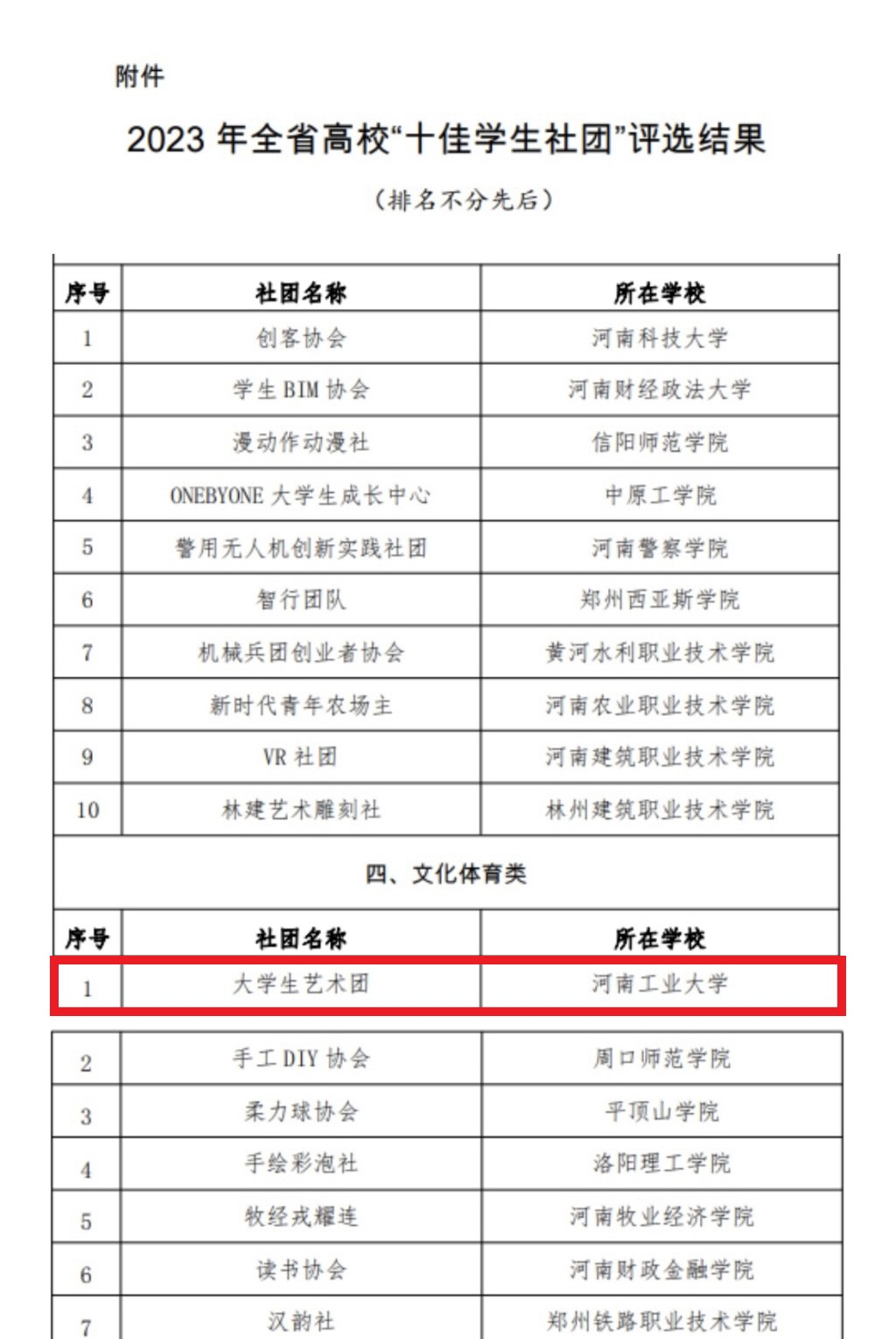 近日,由省委教育工委、省教育厅《关于开展2023年全省高校“十佳学生社团”评选的通知》(教思政函〔2023〕387号)要求,经乐鱼online(中国)推荐、专家评审等环节,共评选出六类十佳学生社团。我校“大学生艺术团”成功入选高校“十佳学生社团”。