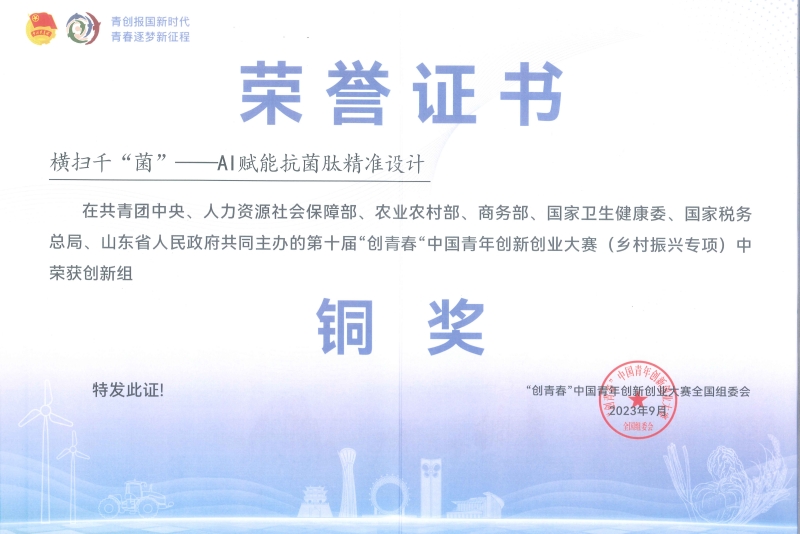 大赛为青年创业者提供创业指导、展示交流、资本对接、骨干培训等支持,打造团组织、青年创业者、社会创服机构共创、共享、共赢的青年创新创业嘉年华。我校信息科学与工程学院报送的《横扫千“菌”——AI赋能抗菌肽精准设计》项目经过激烈的路演与答辩,荣获国家级铜奖。