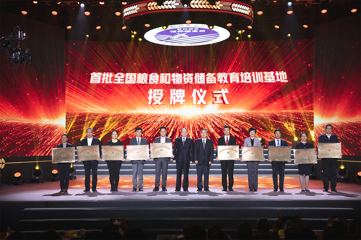 10月16日,国家粮食和物资储备局、农业农村部、教育部、科技部、全国妇联,江苏省人民政府以及联合国粮农组织在江苏南京联合主办2023年世界粮食日和全国粮食安全宣传周主会场活动。活动现场,集中宣传推广了部分“践行大食物观 保障粮食安全”典型案例,并为首批全国粮食和物资储备教育培训基地授牌。河南工业大学副校长陈桂香代表乐鱼online(中国)接受授牌。